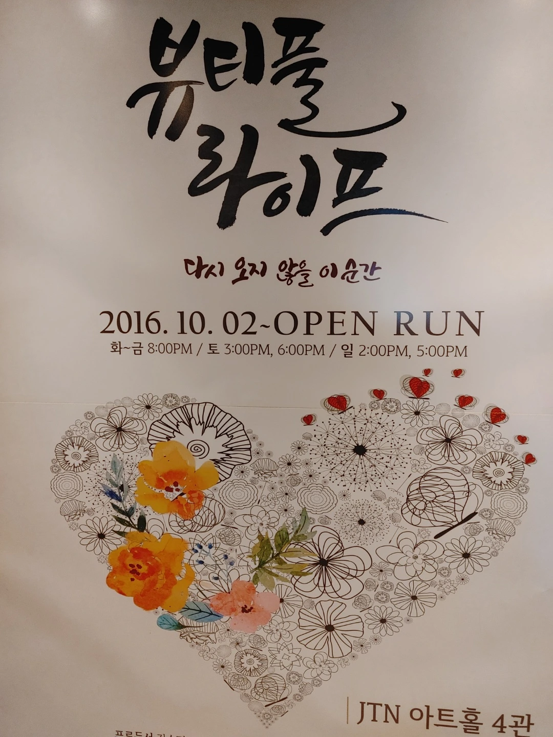 봄이 오면 뷰티플 라이프를 한 번 봐줘야 합니다. 그 흔한 멀티맨 하나 없이 2인극으로서 작품의 완성도와 재미와 감동.. 연극에서 기대할 수 있는 모든 것을 맛볼 수 있을 뿐만 아니라, 그야말로 어떤 일이 있더라도 인생을 긍정할 수 있는 힘을 얻어나올 수 있으니까요.