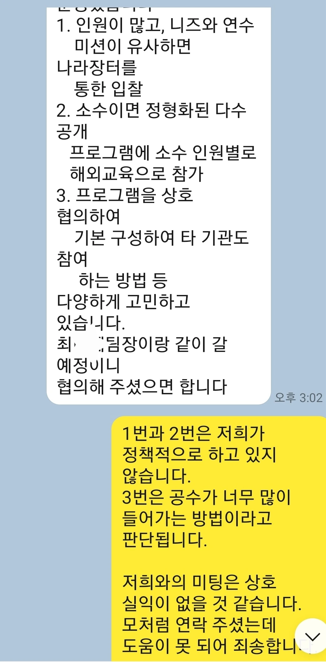 물품이나 참여사의 인력만으로 공급되는 용역의 경우는 몰라도 국제간의 약속이 가지는 성격이나 방문요청시의 예의, 그리고 교육이라는 속성의 어느 하나도 존중받지 못하는 저가 입찰은 '시장경제'가 아니라 '시장사회'의 한 단면입니다. 돈을 냈으니 그 무엇이든 살 수 있는 것 아니냐는, 잘못된 가치관이 보입니다.