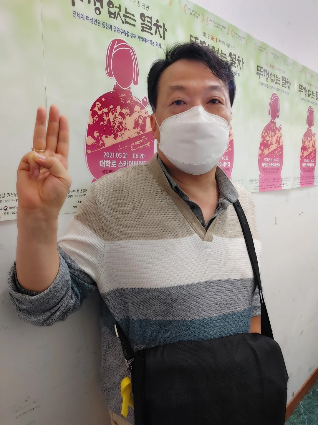 위안부를 다룬 기념 연극 '뚜껑없는 열차'를 보러 나왔습니다. 제 섹시 포인트를 높여주는 목걸이도 빼고 기름기도 뺀 상태에서, 위안부와, 늘 가방에 함께 하는 세월호 리본과 미얀마 시민들을 위한 세 손가락 인사로 사진을 찍고 극장 안으로 들어갔습니다.
