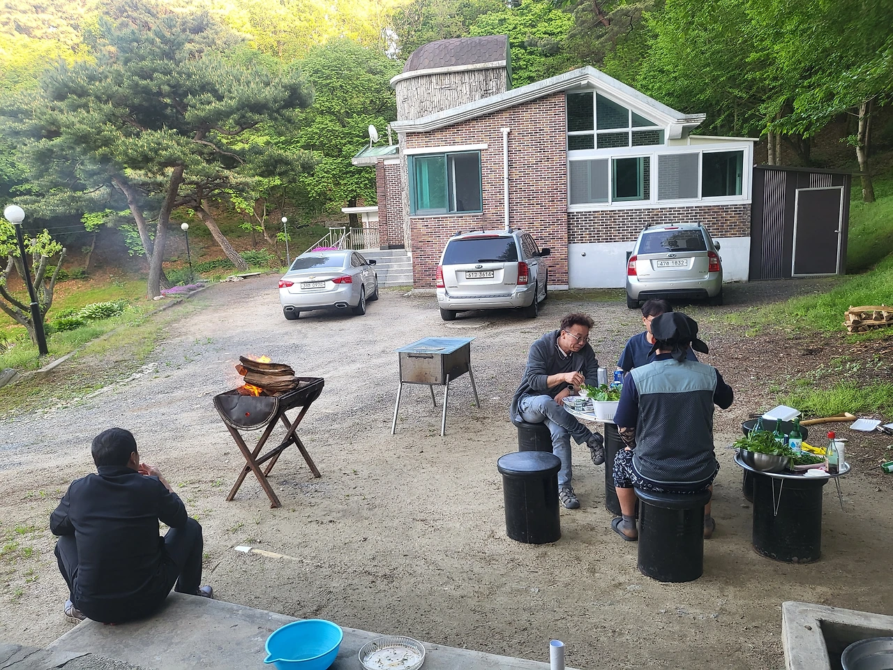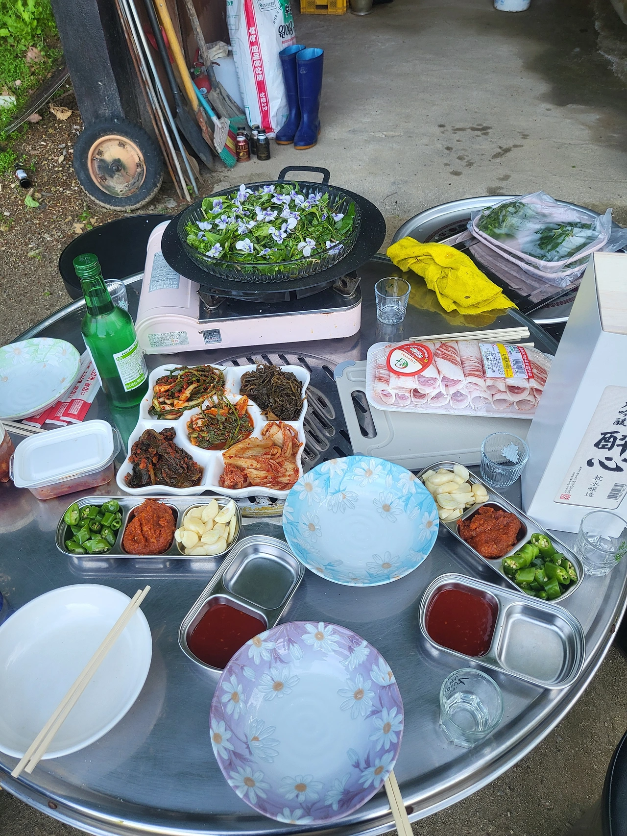 장뇌삼에 산양삼을 애피타이저로 씹어먹고 온 천지 산과 들을 다니며 채취한 산의 푸성귀들과 친구가 재배한 야채들에 차돌박이, 목살에 삼겹살에 제주산 갈치까지 좋다는 것은 다 갖추어서 반나절을 흠뻑 먹고 마시고 즐겼습니다.