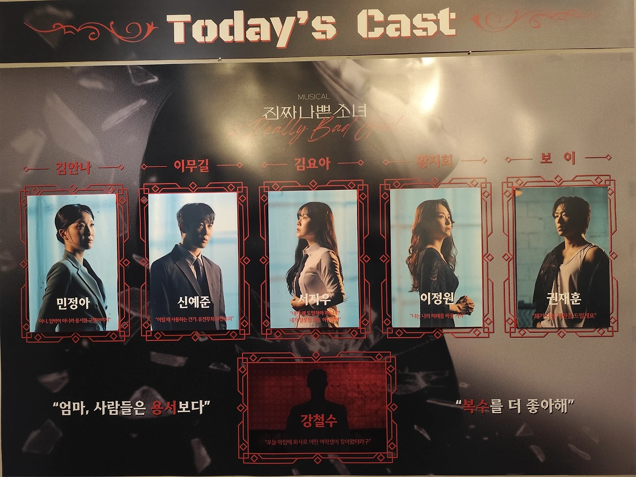 배우들의 연기와 노래도 좋았는데 특히 유아역의 서지우 배우의 노래에 깜짝 놀랐습니다. 연기도 마찬가지고요. 아 그리고 넘버들도 너무 좋았습니다.