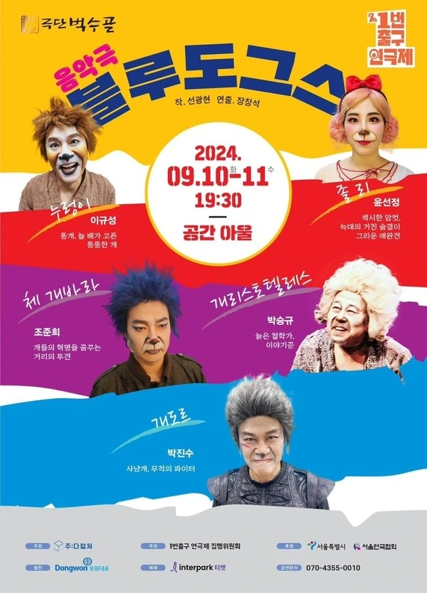 오늘 작품은 제7회 1번 출구 연극제 초청 작품인 음악극 블루독스입니다. 사냥개 출신의 깡패 같은 개도르, 먹을 것에만 관심이 있는 누렁이, 자신이 늑대라는 착각 속에 살고 있는 체개바라, 늙은 철학자 개리스토텔레스, 그리고 유일한 암케인 안젤들리나 졸리.