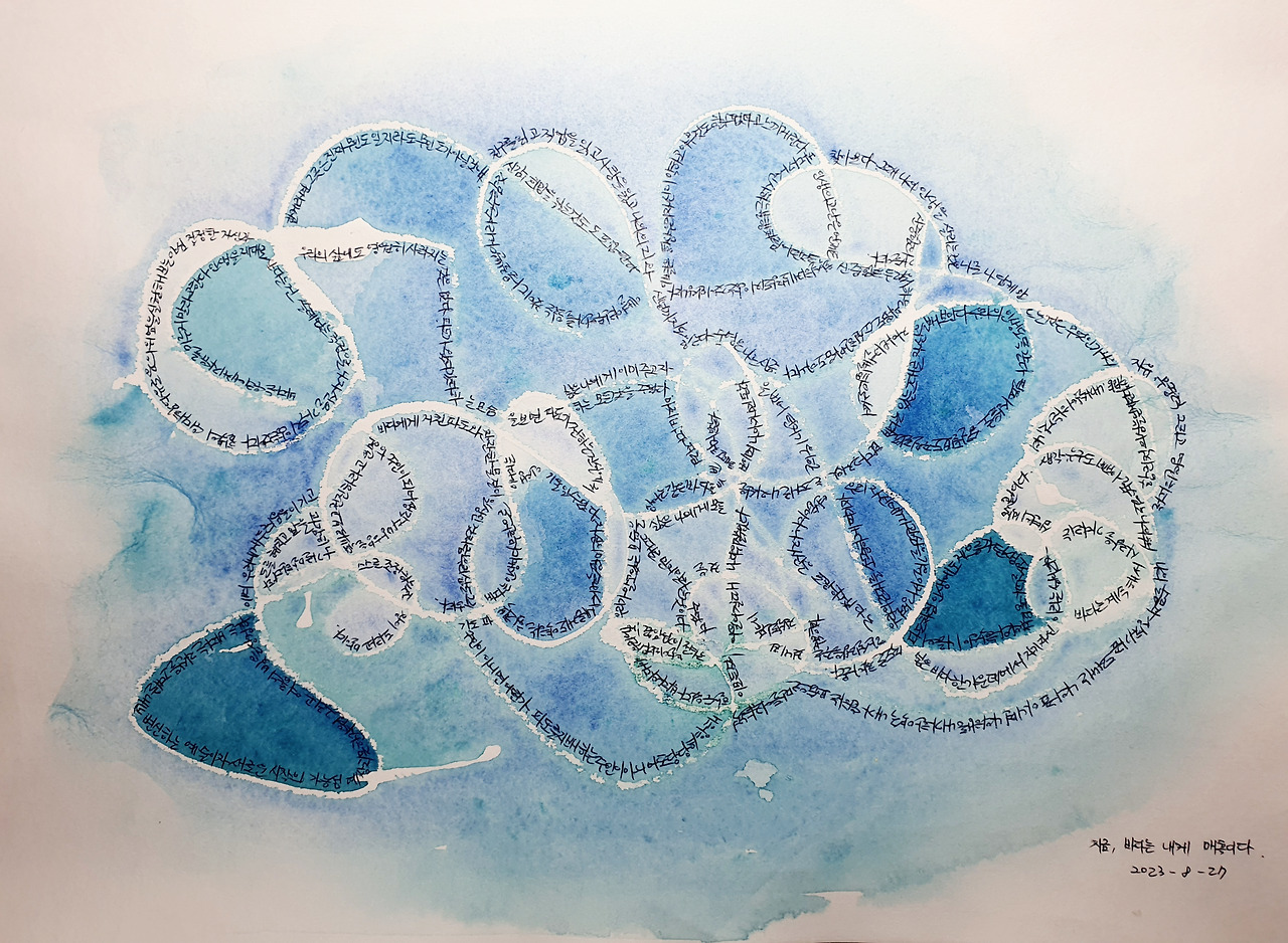 크레파스로 흰색 선을 긋도 도화지를 흡뻑적셨다. 어떤것은 물 웅덩이가 되고, 어떤것은 담아내지 못하고 흘러넘쳤다. 어떻것은 물을 가두지 못해 어디론가 흘러갔다. 파란 물감이 한방울, 한방울 떨어지면 저마다의 공간에서 색이 번진다. 어떤것은 가두고, 어떤것은 흘러가고, 어떤것은 스며든다. 도화지를 흔들때마다 스며들지 못한 물들은 크레파스 선을 타고 흘러간다. 마치 스케이트를 타듯, 미니카가 트랙을 돌듯, 유속이 강한 유스풀을 돌듯 흘러간다. 즐겁다. 바다놀이가. 즐겁다. 바다에서 유영이.