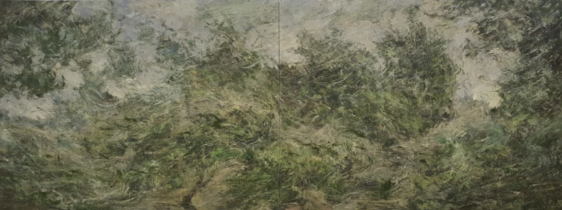 <'바비'가 온 정원>은 2020년에 태풍 바비가 제주도에 들이닥친 모습을 그린 것이다. 태풍의 모습이 어찌나 심한지 정원의 나무를 거세게 흔들어 놓고 있다. 강요배 작가는 이 그림을 그릴 때 붓 외에도 지푸라기나 종이를 구겨 바람이 부는 모습을 그렸다고 한다. 가로 6미터가 넘는 대형 캔버스 위를 작가에 손은 때로는 거센 태풍이 되어 캔버스를 긁어내고, 때로는 흔들리는 나뭇가지가 캔버스 위로 흐트러진다. 태풍 '바비'의 위력이 어찌나 심한지 나무가 외풍을 잘 견뎌 냈을까 싶은 걱정이 들기도 하다. 이 휘청거리는 나무를 그리는 작가의 마음, 그리고 나무 위에 바람을 거칠게 표현했던 그의 마음에 잠겨 본다.
