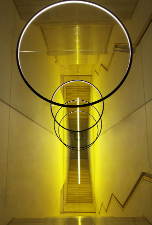 리움미술관 2층으로 올라가는 계단에는 올라퍼 엘리아슨의 <중력의 계단>이 설치되어 있다. 얼핏 보기에는 천장에 원형의 링이 매달려 있는 것 같이 보이지만 실제는 반원만 설치되어 있다. 천장에 거울이 설치되어 있어서 반원은 완전한 원형으로 보이도록 해 준다. 우리 눈에 보이는 것 중 1/4만 실재하는 것이며 나머지는 거울에 반사되어 비친 이미지이다. 실재하는 것은 일부이지만 거울을 통해 우리는 설치된 구조물을 완전한 구로 인식할 수 있게 된다. 또한 거울을 통해 좁은 공간이 확장되고 확장된 공간은 태양계에 있는 행성의 배치와 같다는 상상을 가능케 한다.