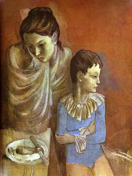 피카소는 장밋빛 시대에 광대들을 주로 그렸다. 이때 그린 <광대들(아머니와 아들)>에서는 막 서커스 공연을 마치고 내려온 것처럼 어머니와 아들은 아직 공연복을 입은 채로 있다. 그들의 얼굴은 근심으로 가득 차 있다. 그러나 고혹적인 아름다운 그녀의 얼굴을 보면 가난하지만 허름하지 않은 묘한 매력을 발산한다. 사람들은 이 작품에 대해서 그녀의 아름다움 때문에 슬픔이 무의미해 보인다거나, 음식이 보잘것없다 한들 대수롭지 않아 보인다고 말한다. 마치 가난도 이렇게 아름다워 보일 수 있다고 표현하기도 한다. 실제 모자의 모습은 아름답게 느껴져 이들의 궁핍과 고통에 마음이 집중되지 않는다. 어쩌면 이들의 비애가 이들을 더 아름답게 보이게 만든 건지도 모르겠다.