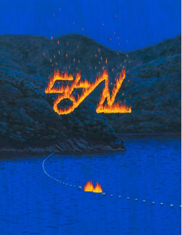 그림 속의 장소는 산이 있는 호수이다. 누군가와 함께 여행했던 장소였는지도 모르겠다. 새벽의 어둠이 붓으로 툭툭 점을 찍듯 무심하게 색칠되어 있고, 검푸른 어둠 위에 '당신'이라고 쓴 타이포그래피가 불꽃 모양으로 이글거리며 타오른다. 어둠을 뚫고 눈부심이, 무심함을 녹이는 뜨거움이, 고요함을 뚫고 나오는 유쾌함이 타오른다.