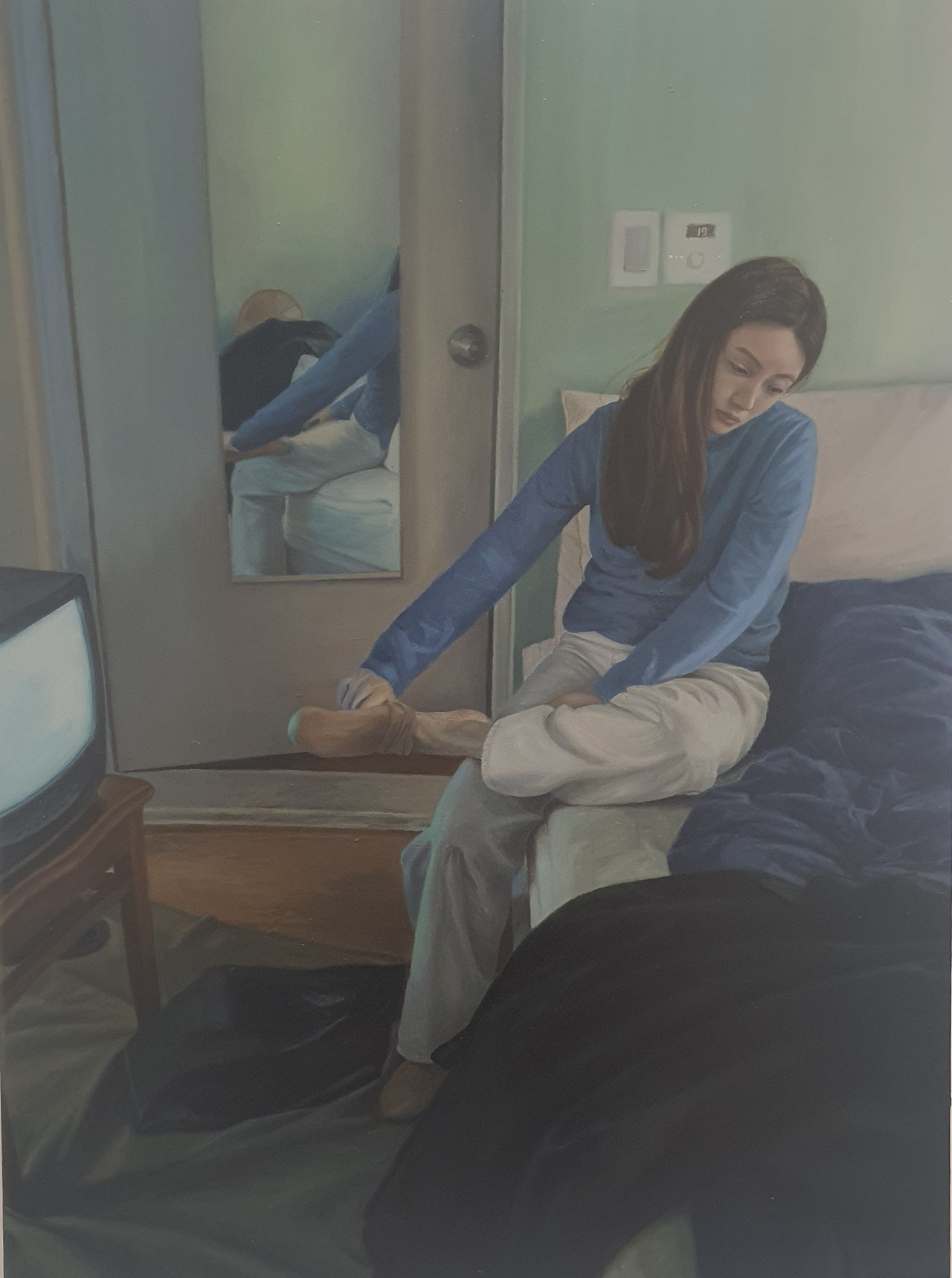 작가는 모델의 개성을 표현하거나 인물의 내면을 그림으로 그리지 않는다고 한다. 작가는 자신이 만든 세계 속에 모델을 등장시키고 배역을 주고 캐릭터를 설정하여 영화감독처럼 작업한다. 작가는 자신의 세계(그림)에 젊은 이들을 등장시켰고 그들은 홀로 있어 고독하거나 둘이 있지만 소외된 상태로 그려졌다. 홀로 있을 때보다 둘이 있을 때 훨씬 더 외롭고 소외된것으로 보여진다.