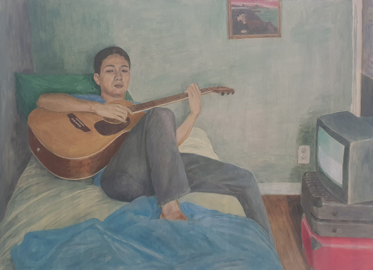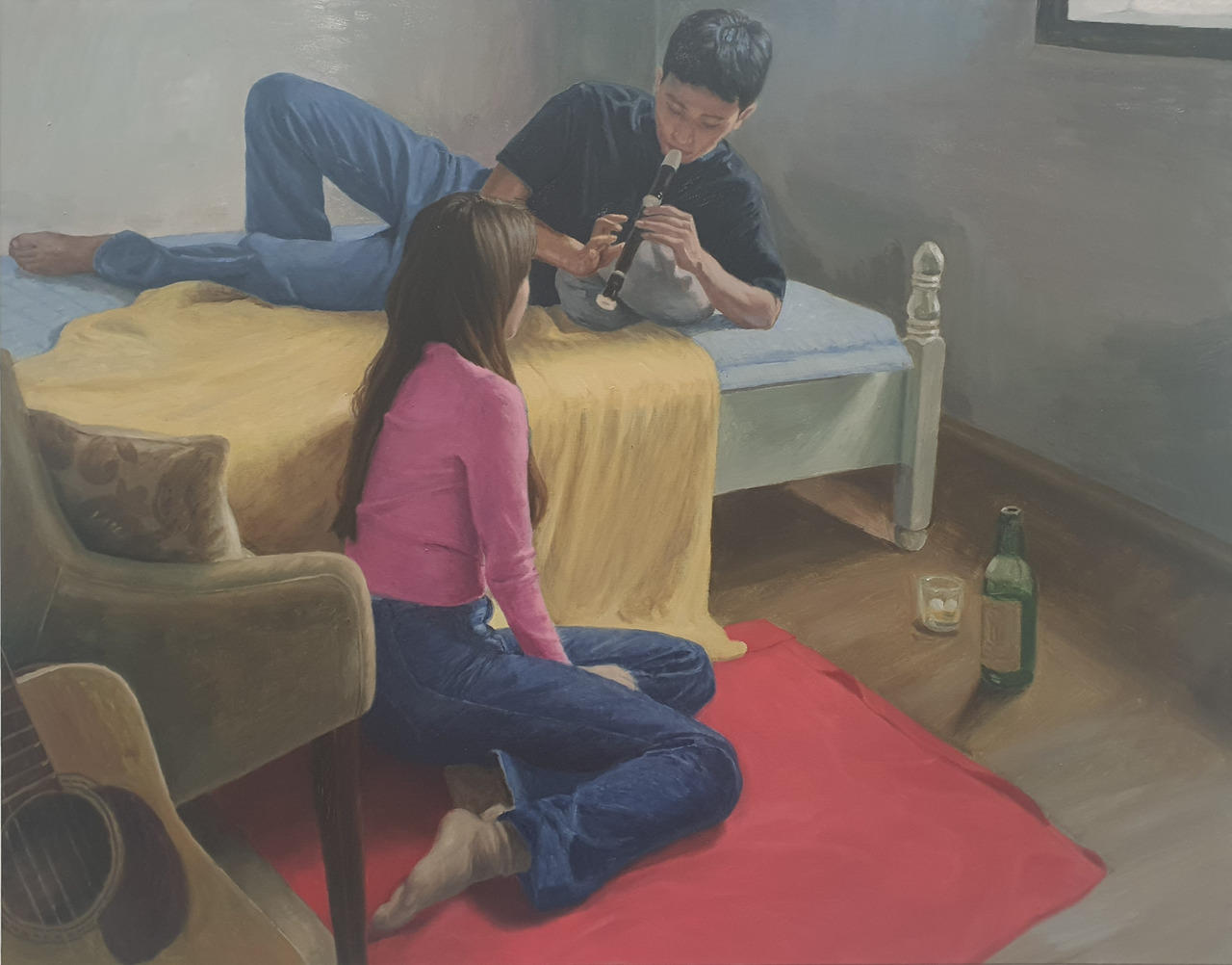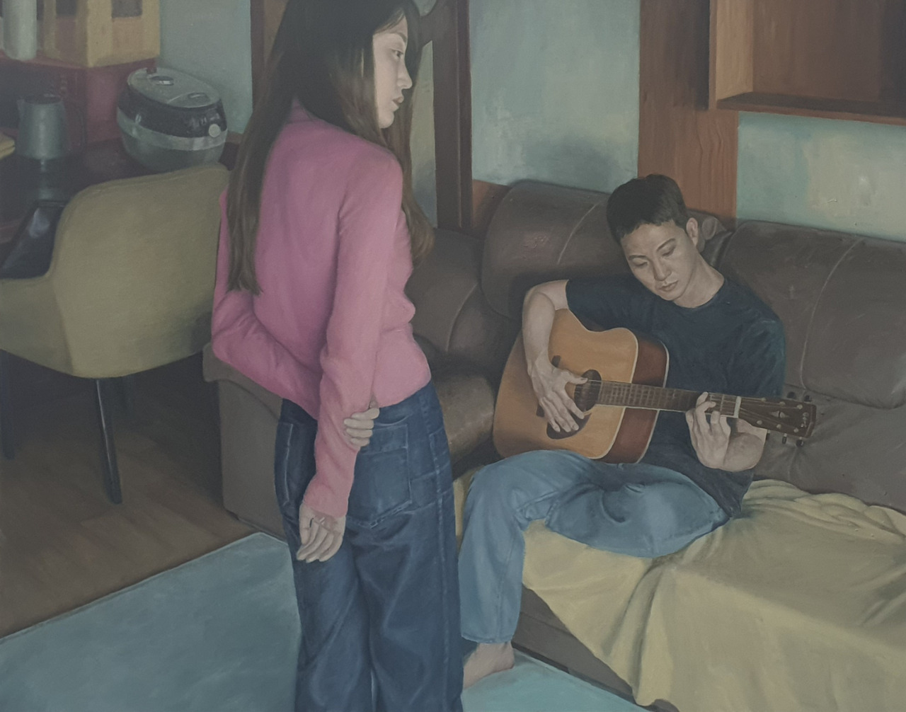 <기타연습>의 서사를 따라가 보자. 남자는 소파에 앉아 기타를 치고 있다. 자세로 보아하니 여자에게 연주를 해주기 위해 각 잡은 모습이 아니다. 아마도 기타 코드를 연습하고 있는 중인 듯하다. 가타의 음이 제대로 잡히는지 손가락의 느낌과 귀에 온 신경이 집중되어 있다. 그런 남자에게 여자가 다가가고 있다. 여자는 남자 앞에 멈추어 서서 긴장이 되는지 두 손을 뒤로 비틀었다. 아마도 긴 시간 고민했던 말들을 있는 듯하다. 그러나 아직 입을 열지 못한 채 남자가 자신을 바라보기를, 혹은 입을 뗄 타이밍을 생각하고 있다. 혹은 이 시간이 부질없다고 느낄 수도 있겠다.