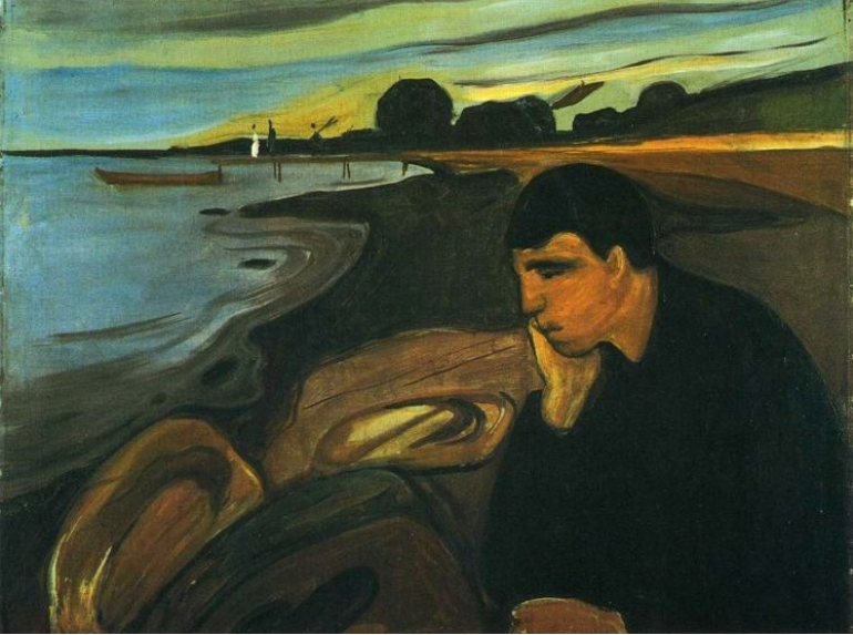 르네상스 시대에는 철학자처럼 지적인 활동을 하는 사람은 멜랑콜리에 빠지기 쉽다고 하였고 낭만주의 시대에는 멜랑콜리가 예술가의 천재성을 드러내는 징표라고 여기기도 했다. 그러다가 정신분석학자 프로이트에 와서는 멜랑콜리가 애도되지 못한 슬픔의 감정이라고 정의했다. 사랑의 대상을 상실했을 때 그 대상에 달라붙었던 리비도(삶의 에너지)가 애도되지 않고 슬픔으로 남아 있는 상태를 멜랑콜리로 보았다. 현대의 멜랑콜리의 정의는 프로이트식의 정의가 여전히 유효하며 우울과 비슷한 감정으로 사용된다. 뭉크가 그린 <멜랑콜리>는 가족들과의 사별, 연인과의 이별 사건 등에서 애도되지 못한 채 남겨진 슬픔을 표현한 것이다.