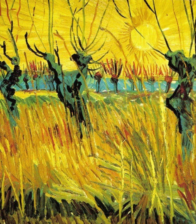 고흐는 세계를 흔들리는 선과 빛나는 색으로 묘사했다. 고흐의 그림에서는 태양에너지가 파도처럼 흔들린다. 그 파동에 나무도 땅도 함께 리듬을 맞추어 움직인다. 나무의 그림자가 마치 뿌리처럼 보이기도 하고 땅의 모양이 울퉁불퉁하여 파도가 치는 것처럼 느껴진다. 이 그림에서는 빛 에너지도, 물도, 나무도, 대지도 태양의 빛과 함께 흔들거린다. 실제 나무를 보면 독립된 개체로 단절되어 보이지만 이 그림에서는 하늘도 땅도 나무도 서로의 정신이 바닷물처럼 서로에게 흐르는 것처럼 느껴진다.