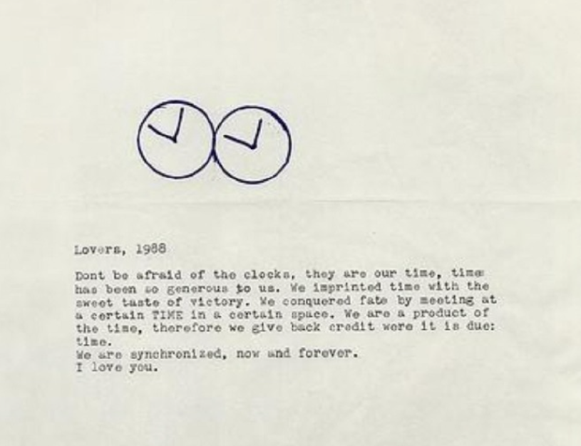 시계를 두려워하지 마... 우리는 특정 공간에서 특정한 '시간'에 만나 운명을 정복했어... 우리는 같은 시간에 맞춰졌어. 지금 그리고 영원히(곤잘레스-토레스가 로스에게 쓴 편지)