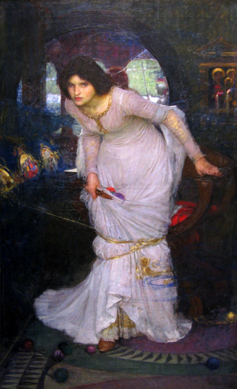 여인이 거울의 비친 마을의 모습을 보며 태피스트리를 만들던 어느 날, 거울을 통해 한 남자를 보게 된다. 그를 거울이 아닌 실물로 보고 싶다는 욕망을 품게 된다. 그녀는 마을로 내려가면 죽게 된다는 운명에도 불구하고 그를 만나기 위해 성을 빠져나온다. 그러나 그를 만나기도 전에 배 위에서 그만 얼어 죽고 만다.