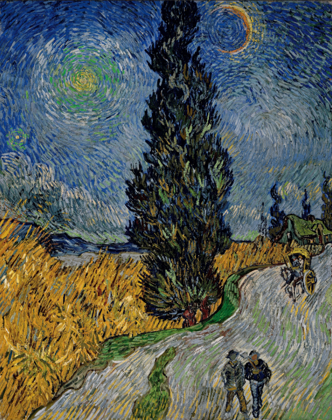 <사이프러스와 별이 있는 길>은 어두운 밤길을 그린 것이다. 흔들거리는 색채들이 불안하게 느껴지기도 하지만 생명의 기운으로 이글거리고 있다. 나무 중앙에 있는 사이플러스 나무는 두 그루가 마치 하나의 나무처럼 엉켜 있고 그 끝은 하늘에 가닿을 것 같다. 길 위에는 함께 걷는 나그네와 마차의 모습도 보인다. 생생하지만 고요한 배경에 다양한 초록색 잎사귀와 색색의 노란색 갈대들이 바람에 나부끼며 부드럽게 바스락 거리는 소리 낼 것만 같다.