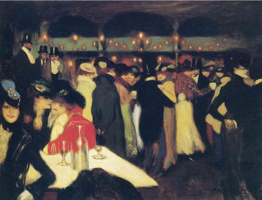 반면 피카소가 그린 무도회장은 욕망이 이글거리는 장소로 묘사되었다. 이 그림에서는 좀 더 공격적이고, 좀 더 과시적이고, 좀 더 충동적으로 느껴진다. 홀로 있는 사람들도 로트렉이 그린 인물들처럼 위축된 것이 아니라 마치 목표물을 포획하기 위해 때를 기다리는 사냥꾼 같은 표정이다.