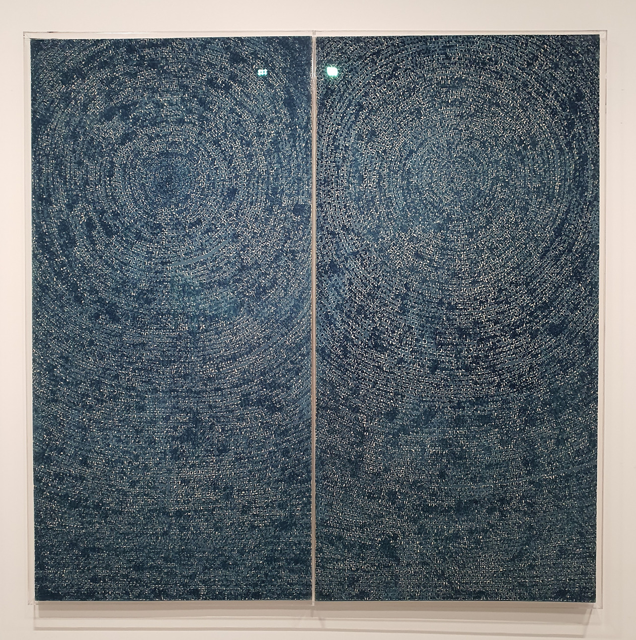 두 우주가 만났다. 나의 세계와 너의 세계. 나와 너가 함께하는 세계이다. 두 개의 캔버스는 비슷한 모양을 하고 서로를 반영하고 있다. 우주를 보고 있으면 마치 회오리 치는 것 같기도 하고 빨려 들어갈 것만 같은 운동성이 느껴지지만, 점의 균일한 형태를 보면 이 작업은 호흡을 가다듬은 상태로 차분히 작업했음을 유추할 수 있다. 이 질서를 유지하기 위해 작가는 얼마나 많은 호흡을 가다듬었을까? 격정이 올라오는 순간을 어떻게 조절해 나갔을까? 질서와 균형을 유지하기 위해 얼마나 많은 붓질을 했으며 얼마나 고된 육체적 고통을 참아 냈을까?
