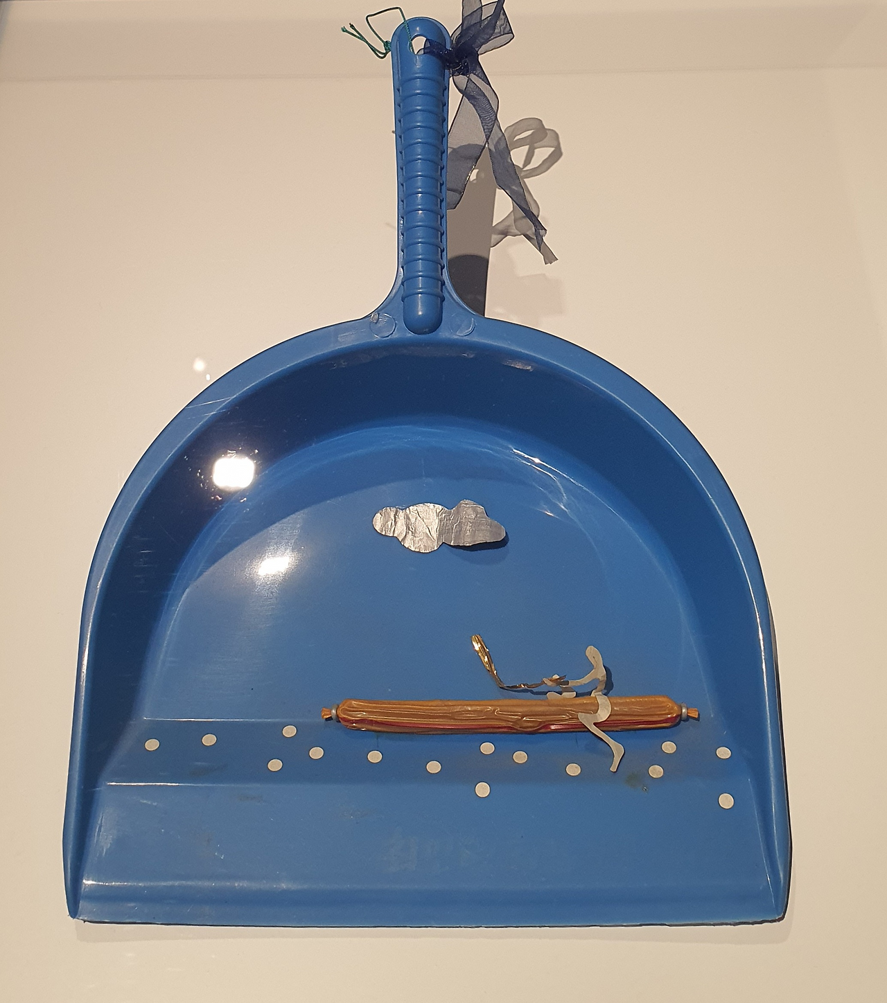 파란색 플라스틱 쓰레기 받이가 정갈하고 투명한 유리관 속에 고이 들어 있었다. 이 작품은 최민 평론가가 자신의 회갑 생일에 주재환 작가로부터 받은 선물이라고 한다. 그래서 작품명이 <최민 형 회갑기념>이다. 주재환(1941~) 작가는 자신의 작품을 '천 원짜리 미술'이라고 부르곤 했다. 위 작품처럼 작품에 사용되는 재료가 재활용품이나 플라스틱 등 비교적 저렴한 가격에 쉽게 구할 수 있는 일상의 물건들이었기 때문이다. 작가는 일상의 재료를 사용하여 일상의 모순을 드러내고 세상의 편견을 풍자한다. 주재환 작가는 일상의 재료를 이용하여 일상의 삶을 작업하는 그야말로 '일상의 예술화'를 실천한다.