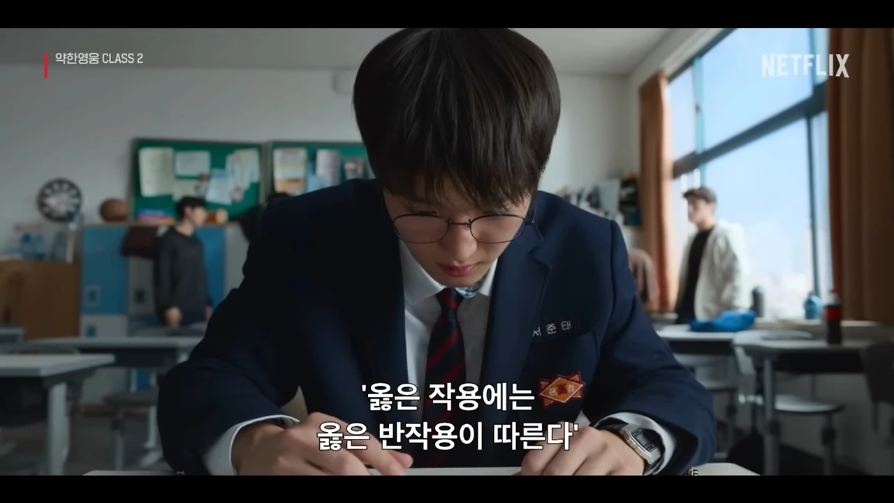 연시은이 알려준 뉴턴 제3법칙을 자기 기준대로 해석하며 그 비겁함을 '용기'로 바꾸며 빠져나온다.
