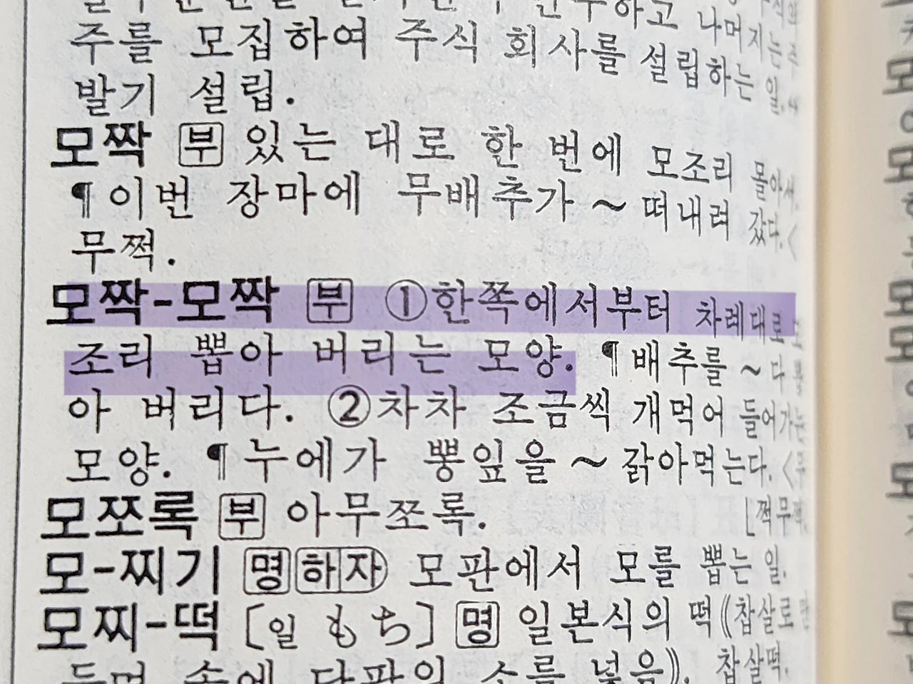 예: 배추를 모짝모짝 다 뽑아 버리다.