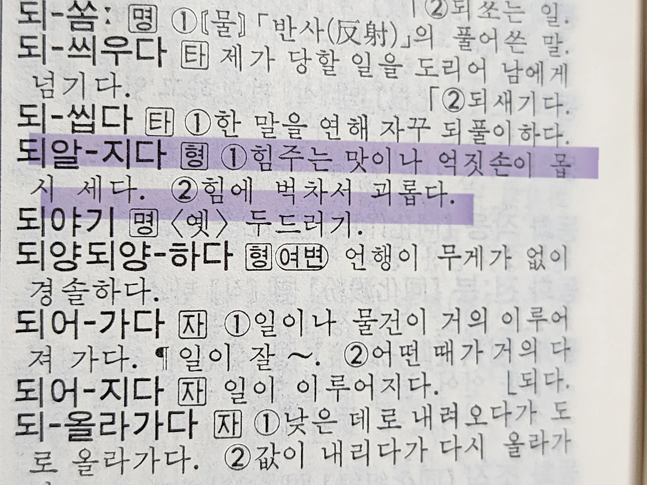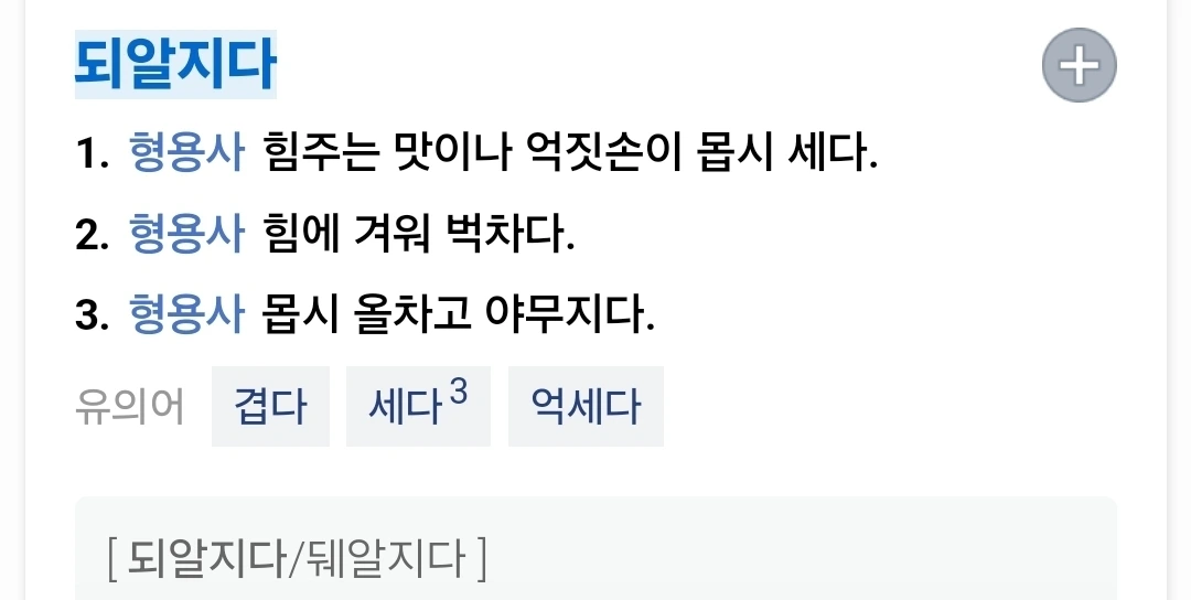 (형) 1. 힘주는 맛이나 억짓손이 몹시 세다 2. 힘에 벅차서 괴롭다.