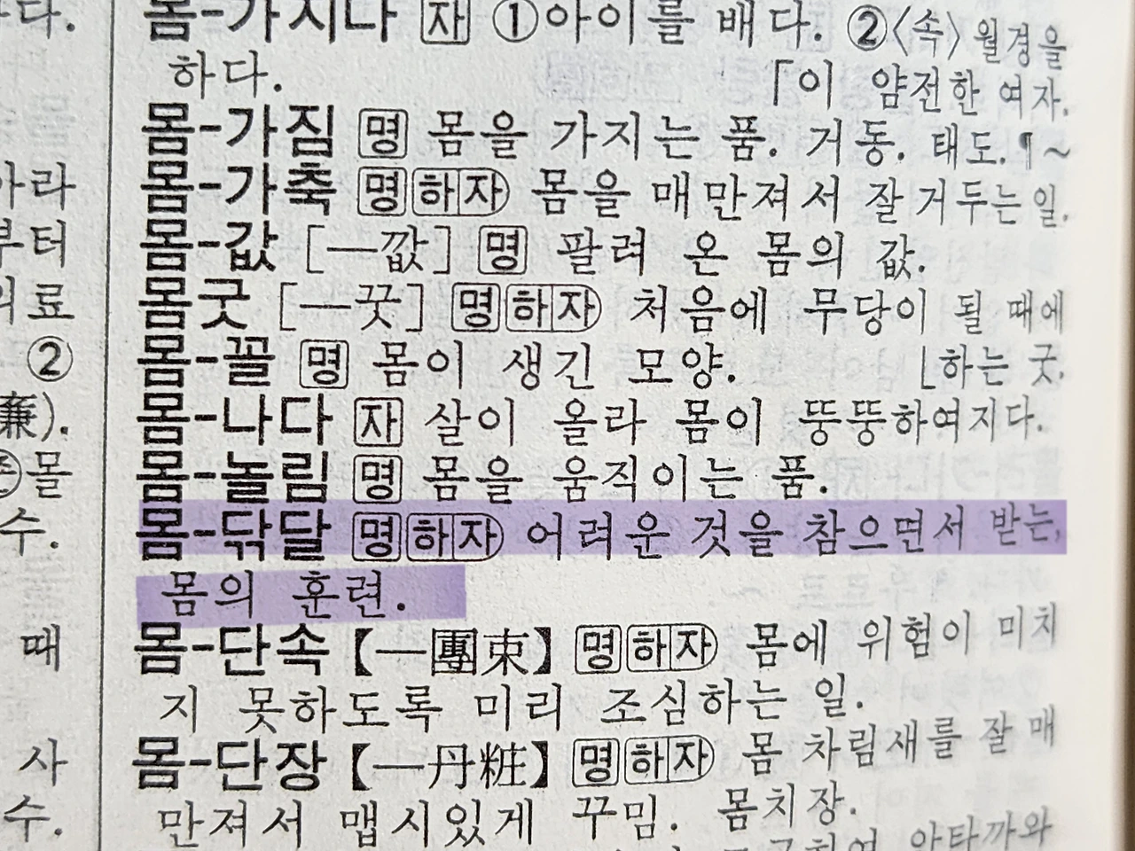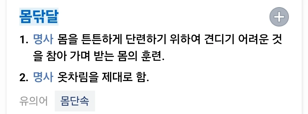 (명) 어려운 것을 참으면서 받는 몸의 훈련