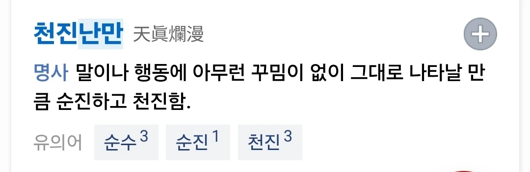 (명) 아무런 꾸밈없이 언행에 그대로 나타남. 순진한