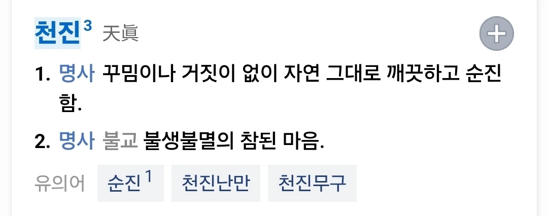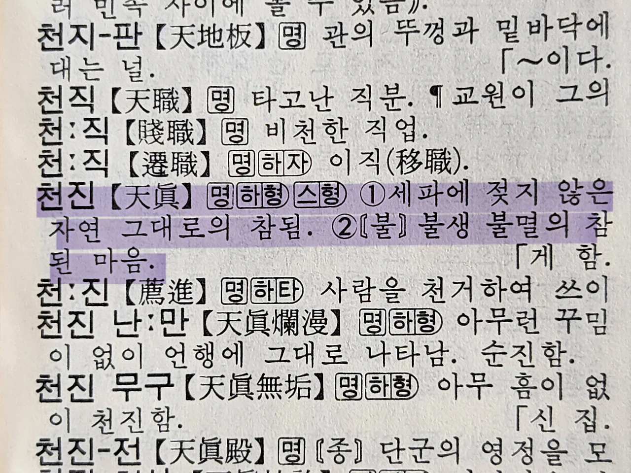 (명) 1. 세파에 젖지 않은 자연 그대로의 참됨. 2. 불생 불멸의 참된 마음