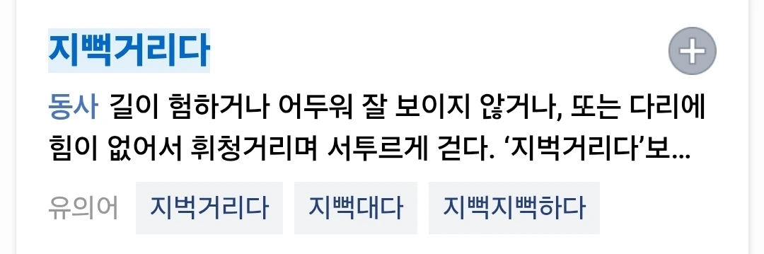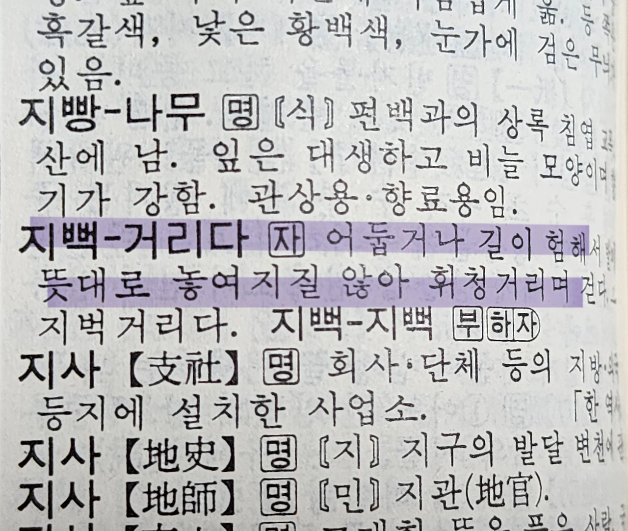 (자) 어둡거나 길이 험해서 뜻대로 놓이질 않아 휘청거리며 걷다. 지벅거리다.