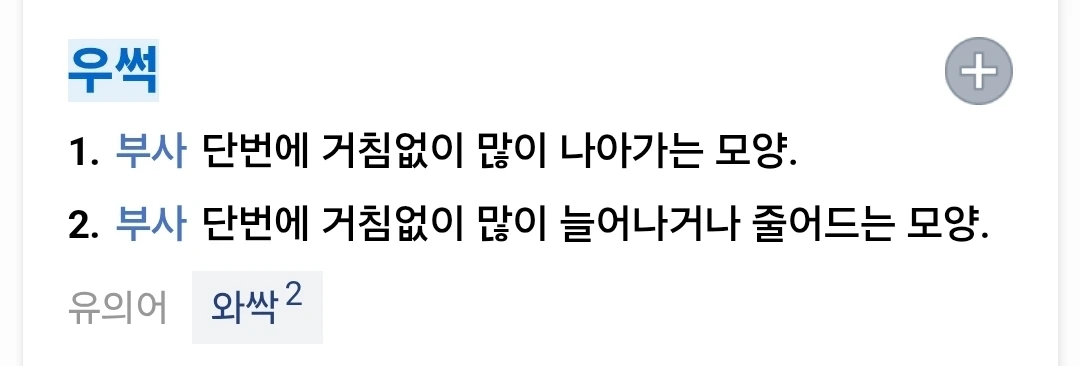 (부) 단번에 거침없이 자꾸 나아가거나 갑자기 늘어가거나 줄어가는 모양 > 와싹