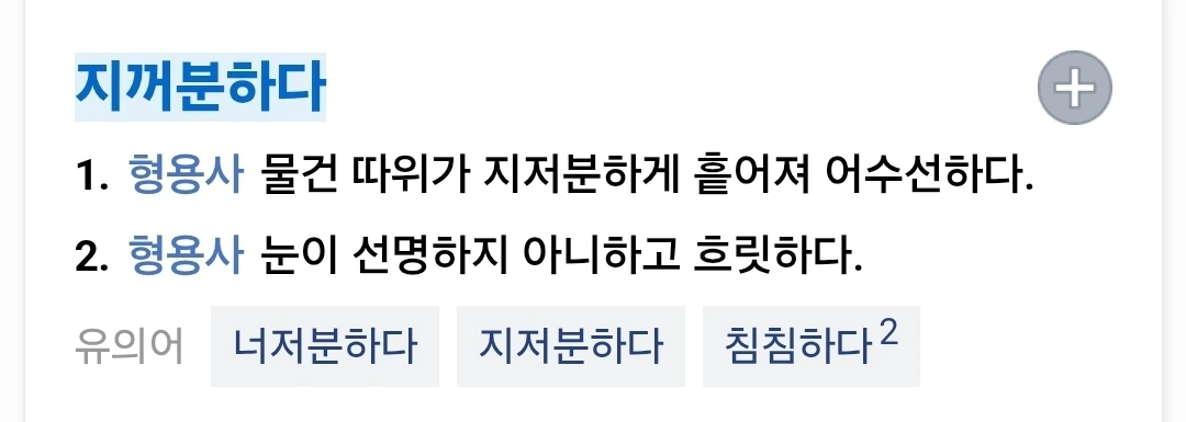 (형) 1. 눈이 깨끗하지 못하고 흐릿하다. 2. 물건이 어수선해 난잡하다