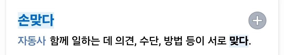 그래서 뒤져봤더니 실제로 ‘손 맞다’라는 말이 있다.