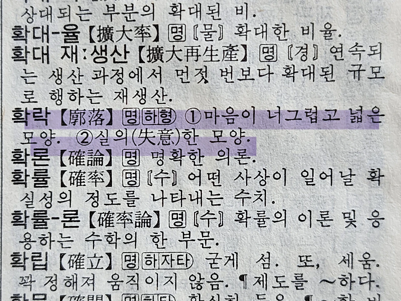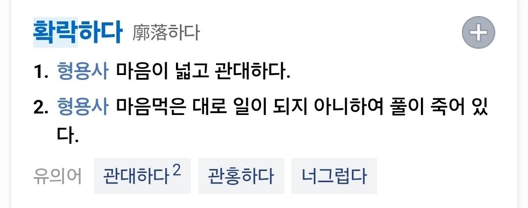 (명) 1. 마음이 너그럽고 넓은 모양. 2. 실의한 모양