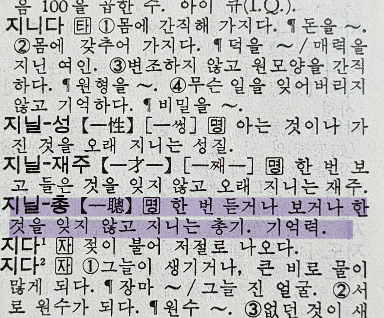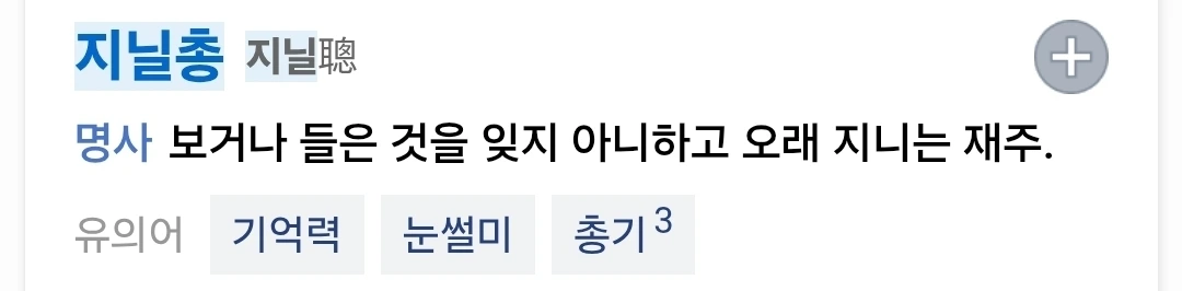 (명) 한 번 듣거나 보거나 한 것을 잊지 않고 지니는 총기. 기억력