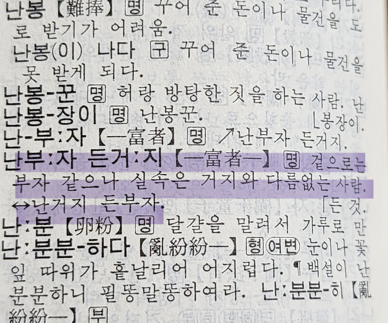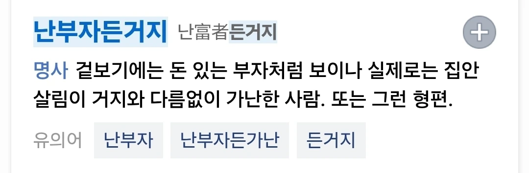 (명) 겉으로는 부자 같으나 실속은 거지와 다름없는 사람 (반) 난거지든부자
