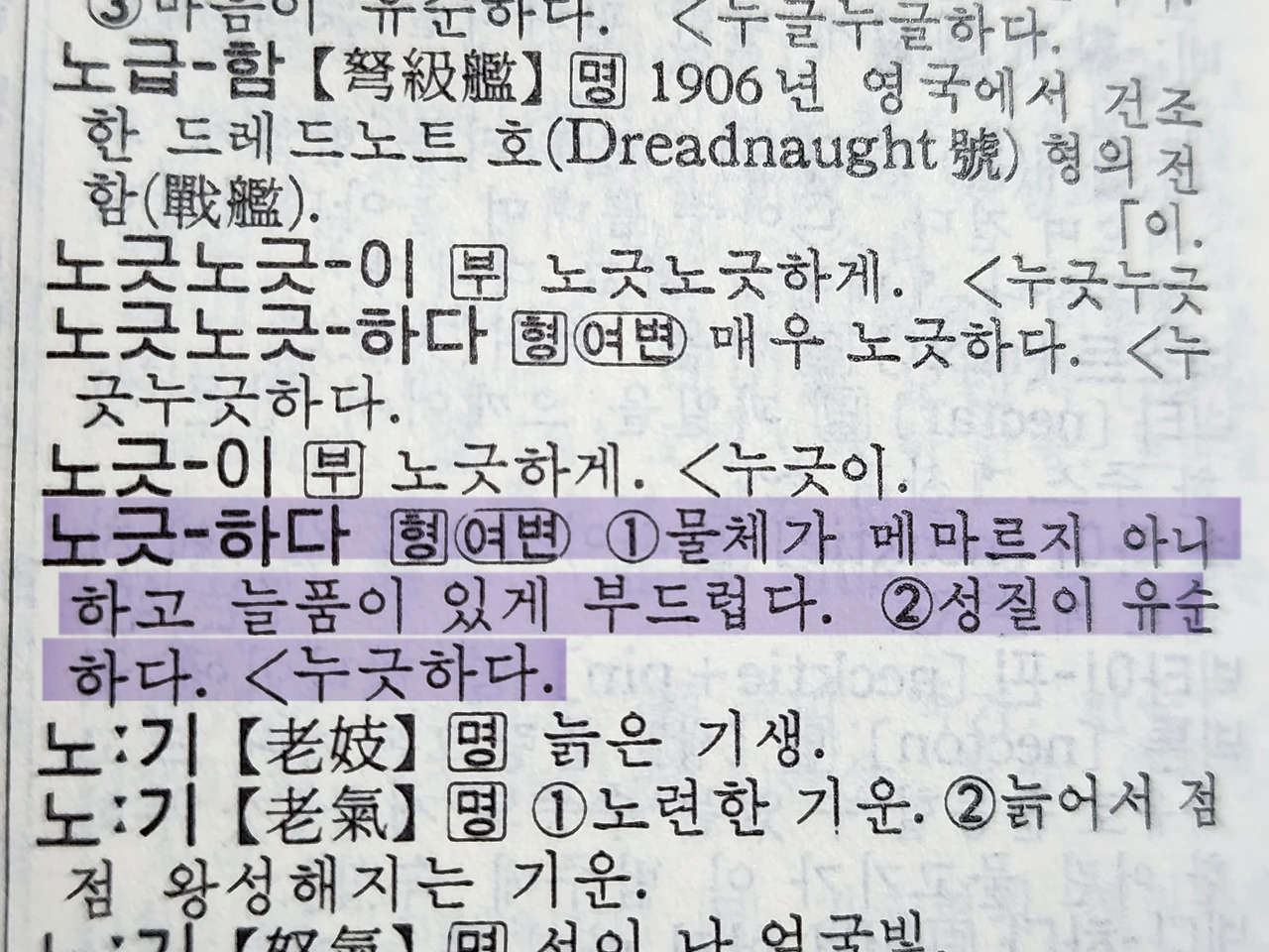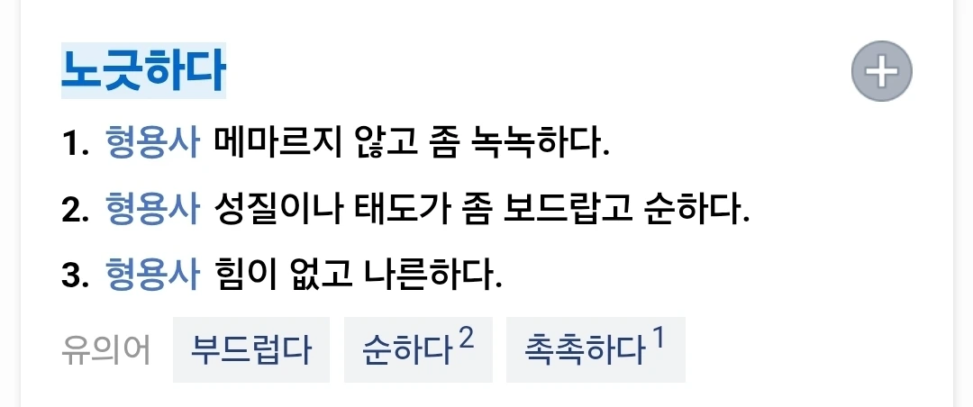 (형) 1. 물체가 메마르지 아니하고 늘품이 있게 부드럽다. 2. 성질이 유순하다 < 누굿하다