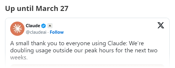 클로드는 약 2주 동안 사용자들의 사용량 제한(usage limit)을 일시적으로 2배 확장했다.