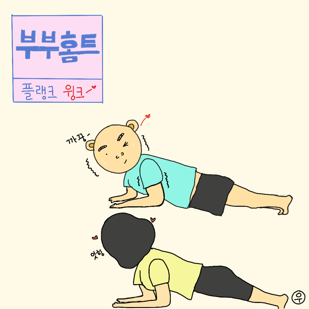 우리 부부 홈트의 가장 큰 장점은 누가 뭐라해도 함께 하는 시간이 많아진다는 것이다. 제대로 카운팅을 하나, 자세가 흐트러지지는 않았나 감시하는 중간 중간 싹트는 사랑! 남편은 하루 열심히 운동하고는, 배가 쏙 들어가지 않았냐며 천천히 만져보라고 하지만 내 생각에 남편의 매력 포인트는 바로 고 통통한 배인걸! 열심히 해보자! 운동 그리고 사랑!