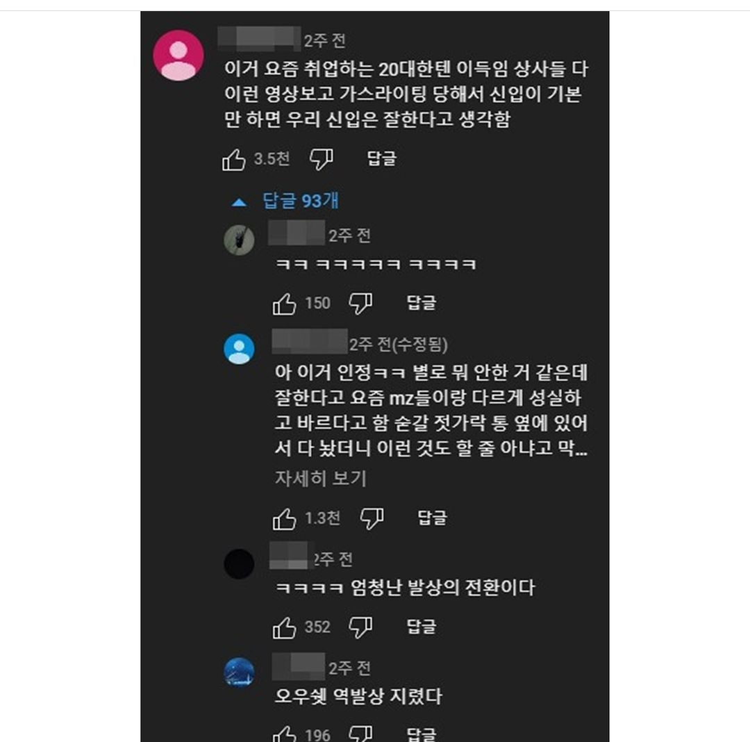 지금의 20대에게는 경제관념 없고, 사회생활 못하고, 일은 하지 않고 권리만 누리고 싶어한다는 최악의 낙인이 찍혀 있다. 몇몇 긍정적인 사람들은 이런 사회 분위기가 오히려 MZ세대에 대한 기대감을 낮춰서 좋다고들 하지만, 나는 그렇게 웃어넘길 문제는 아니라 생각한다. 물론 영상에 나온 부분들이 완전히 틀린 것은 아니다. MZ세대는 과거와 달리 글보다 영상을 더 많이 접한 세대이기에 문해력이 비교적 떨어지며, 개인주의적 성향이 짙은 시대에 자랐기에 공동체에서 처신하는 능력이 다소 부족한 것도 사실이다. 하지만 일을 하지 않고 권리만을 요구하는 직원, 기본적인 예의조차 차리지 않는 직원 등 특정 개인의 문제를 '요즘 세대는 이렇더라' 식으로 일반화하는 것은 어떤 플랫폼이든 지양했으면 하는 바람이다