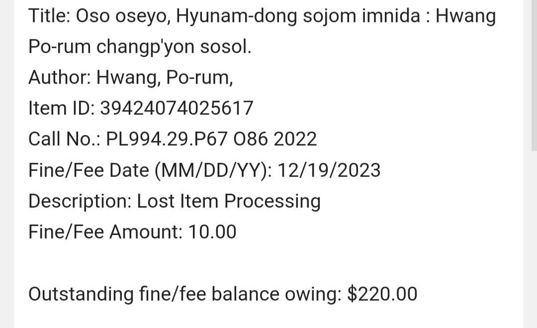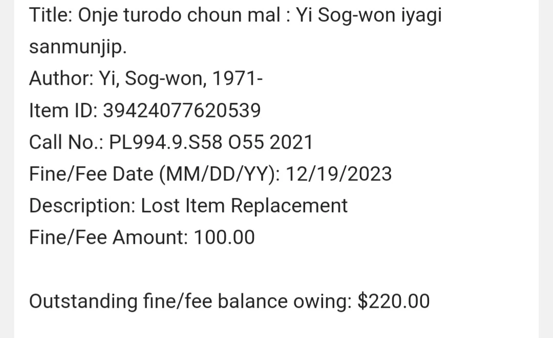 그 사이, 대학도서관에서는 독촉메일을 넘어 벌금안내메일이 왔다. 나도 벌금을 내는 것을 예상은 하고 있었지만, 그 금액은 내 예상을 뛰어넘었다. 책 2권을 다른 곳에 반납하여 분실한 대가는, 220달러였다.