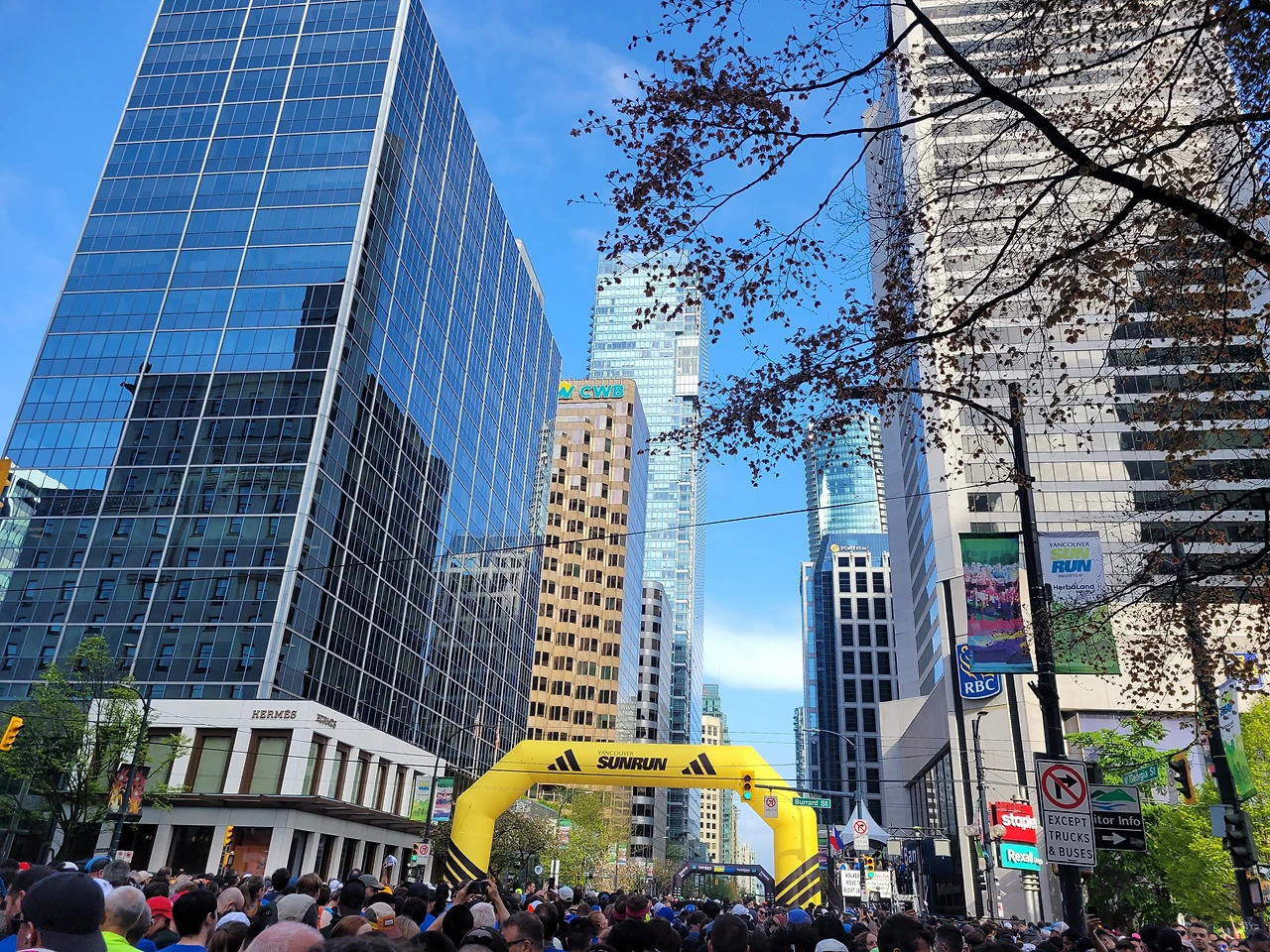 일요일 아침을 밴쿠버 다운타운에서 보내는 것은 처음이다. 달리다 보면 땀이 나서 재킷도 긴팔 티셔츠도 거추장스러워진다는 걸 알기에, 반팔과 반바지 차림으로 차가운 바람을 맞으며 대회 시작을 기다렸다. 조금이라도 햇빛이 드는 곳을 찾아 이동하고, 사람들 틈에 끼어 바람을 피하려 애썼다. "20분 뒤에 여러분의 밴쿠버 마라톤이 시작됩니다...", "10분 뒤에...", "5분..." 그리고 마침내 9시, 마라톤이 시작되었다.