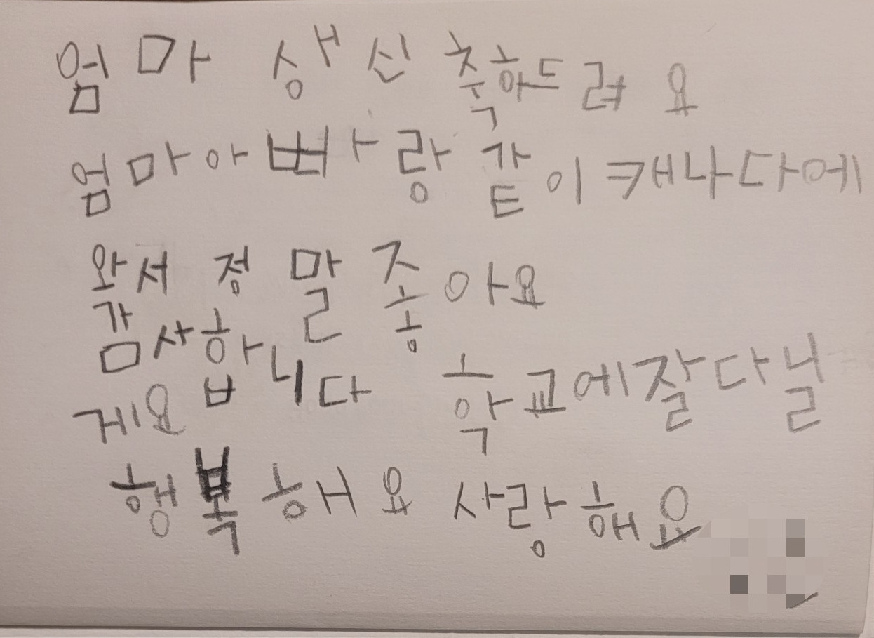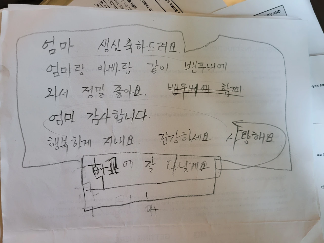 작년엔 사랑해. 적힌 쪽지 하나가 전부였는데 올해는 꼬마가 (남편이 써준 메모를 보고 따라 써서) 무려 5줄로 된 카드를 써주었다! 두 남자가 방에 들어가선 내가 못 들어오게 막고선 꼬마가 글씨를 제대로 못쓴다고 본인의 7살과 비교하며 핀잔을 주고 꼬마는 반박하는 소리가 행복의 소리 같다. 꼬마가 남편이 준비한 풍선을 가지고 놀다가 터뜨려버려 꼬마는 당황해서 울고 남편도 꼬마에게 화를 내는 소리도 행복의 소리.... 맞나? 작은 케이크 주변에 둘러서서 남편과 꼬마가 불러주는 생일축하노래는 확실히 행복의 소리다.
