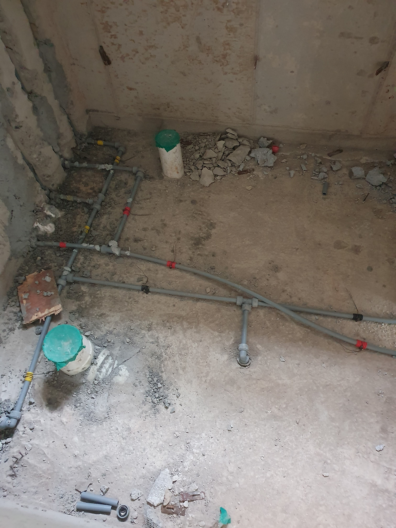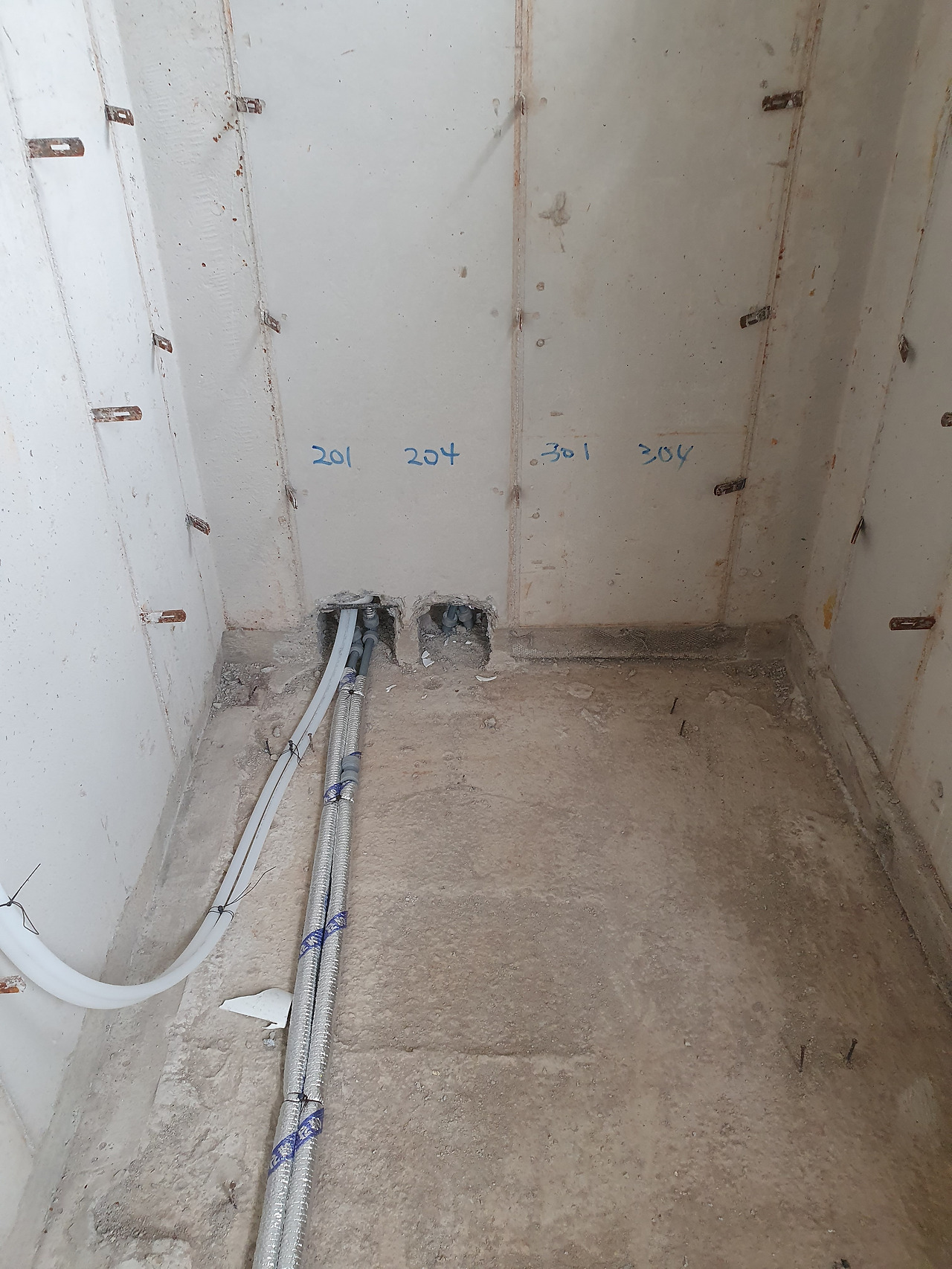 수도배관(빨간색은 온수, 검은색은 냉수), 엘리베이터 발주
