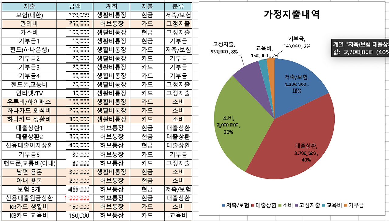 * 고정비(관리비, 난방비, 통신비, 교통비, 기부금) 60만원