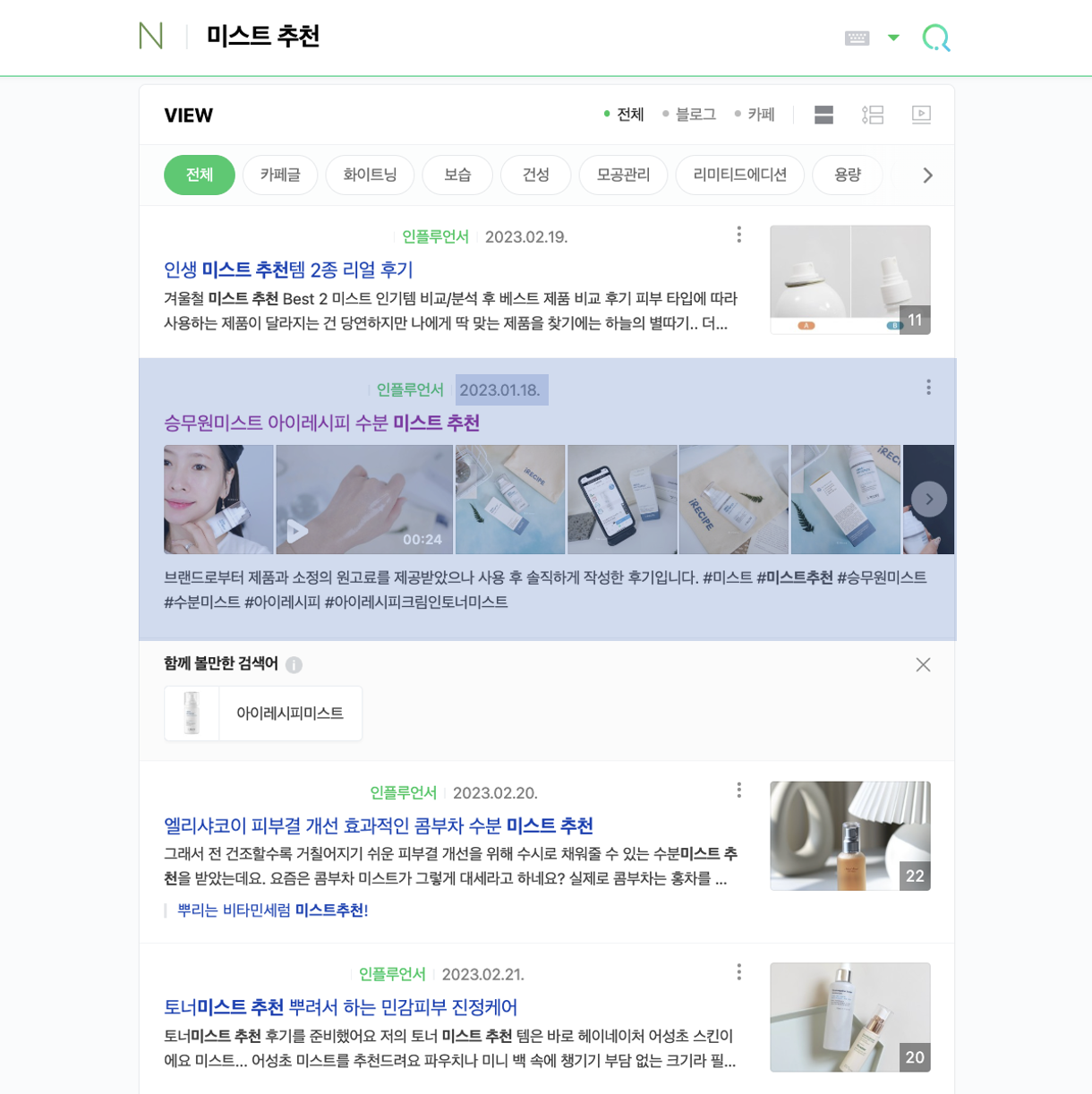 오늘은 '미스트' 키워드에서 네이버 VIEW탭 1, 4위를 차지한 사례를 알아보겠습니다.