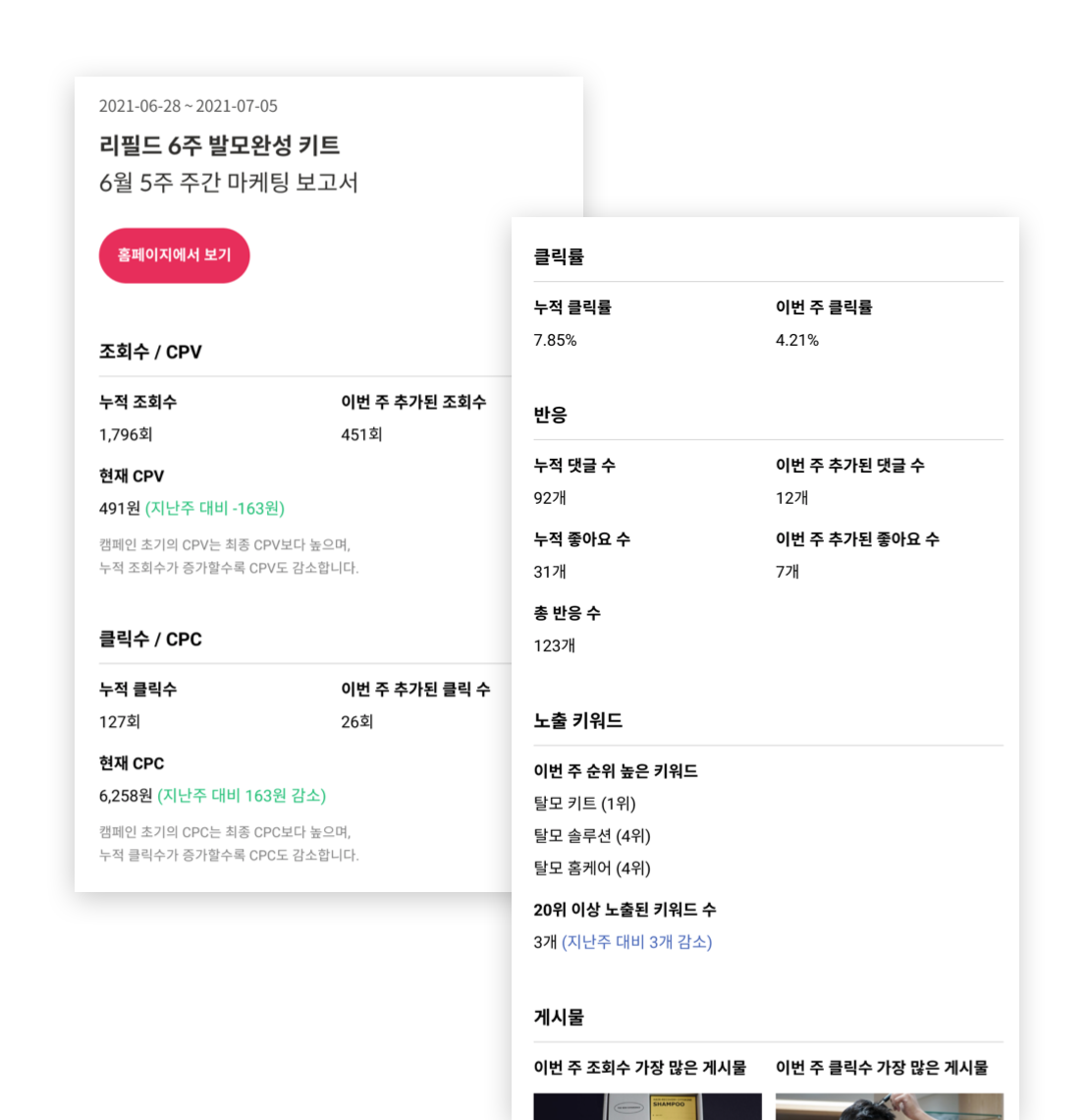 매 주간, 월간 이메일로 마케팅 요약 보고서를 발송해드립니다.