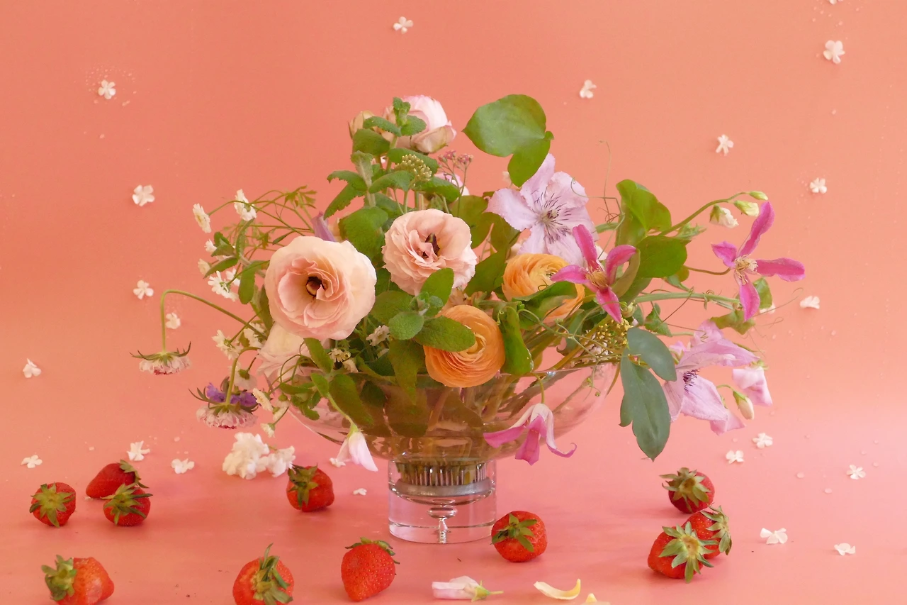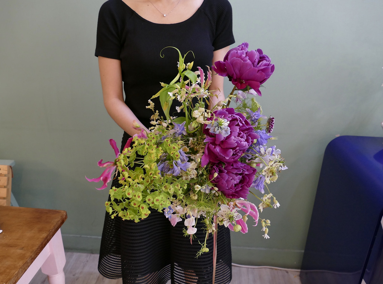 5월 어느날의 원데이 클래스에서 샘플로 만들었던 부케의 꽃들이 시들해져서 모두 풀러 다른 꽃들을 조금 더 추가하여 침봉꽂이로 다시 만들었다. 이제부터 아주 풍성하게 나오는 클레마티스와, 이제 끝물로 들어서기 시작한 라넌큘러스, 그리고 위의 어레인지먼트에 썼던 애플민트가 여기 다시 들어갔다. 봄과 여름의 만남이랄까. 아니면 봄의 끝인사와 여름의 첫인사랄까. 계절이 교차하는 시기는 꽃을 하는 것이 너무나 즐겁고 흥미롭다. 만날 수 없는 꽃들이 아주 잠깐 서로 스치듯 만나고 헤어지는 것은 놓칠 수 없는 호사이다.