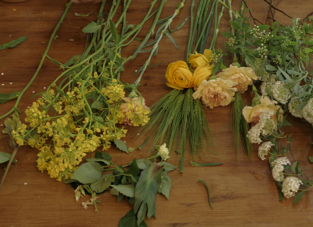 농장에서 얻는 것들이 늘어날 수록 꽃을 하는 즐거움이 커지고 있다. 꽃시장에서 사는 꽃들도 이 들꽃같은 아이들과 잘 어울릴 것 같은 것들로 찾고 산다. 산 것은 캄파눌라, 시레네, 라넌큘러스, 키우고 채집한 것은 수레국화, 토끼풀꽃과 잎, 이름을 모르는 노랗고 작은 꽃, 딸기의 잎, 비올라이다.