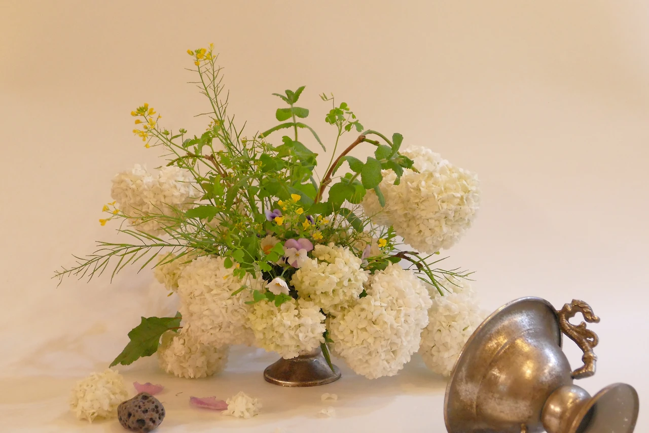 하지만 작년에도 그랬고, 올해도 그렇고, 사실 내가 키우는 것보다 농장 주변에 자연적으로 피어난 꽃들, 나무들, 그리고 아무도 환영하지 않는 잡초들이 더 나의 어레인지먼트를 풍성하게 해주는 것 같다. 특히 내가 다니는 농장에는 아주 큰 불두화 나무가 있는데 가지가 부러질만큼 매년 풍성한 불두화를 피워내고 있다. 그 나무 가지 몇개만 있으면 화기가 터지도록 꽃이 찬다. 다만 너무 무거워서 자꾸만 아래로 늘어지는 불두화들 사이는 잡초들, 클로버꽃들, 내가 키운 비올라와 애플민트, 짧은 마가렛으로 채워 주었다.