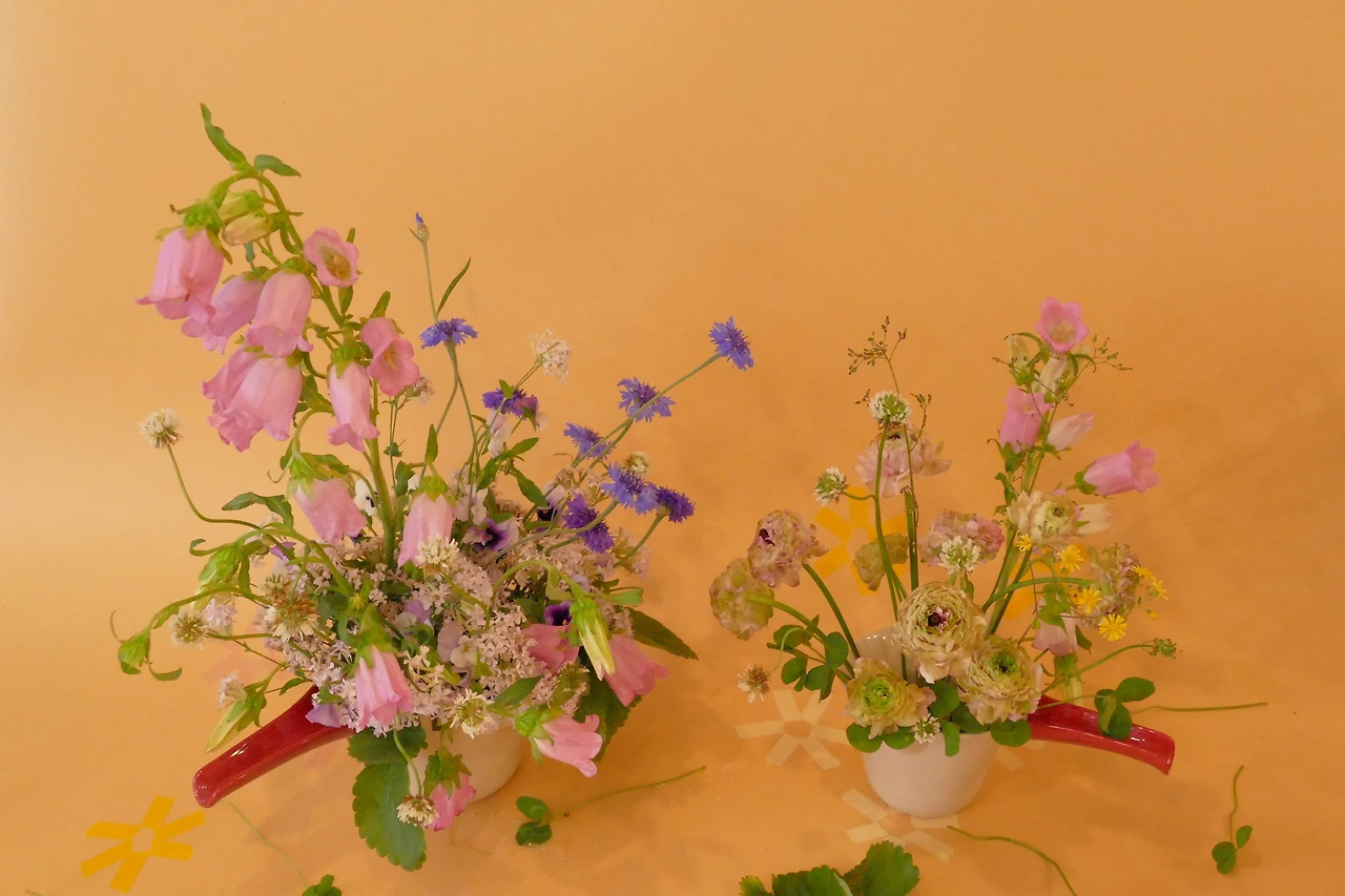 왼쪽의 어레인지는 치킨와이어를 사용했고, 베이스를 시레네로 덮어 와이어를 감춘 뒤 왼편과 오른편의 구획을 나누어 캄파눌러와 수레국화가 세를 겨루는 듯하게 표현했고 토끼풀꽃은 그 둘 사이의 연결자 느낌으로 사용했다. 오른쪽의 어레인지먼트는 캄파눌라의 지원군 같은 느낌을 주고 싶었다. 역시나 토끼풀꽃으로 연결을 했고, 침봉만을 사용하여 어레인지 했다.