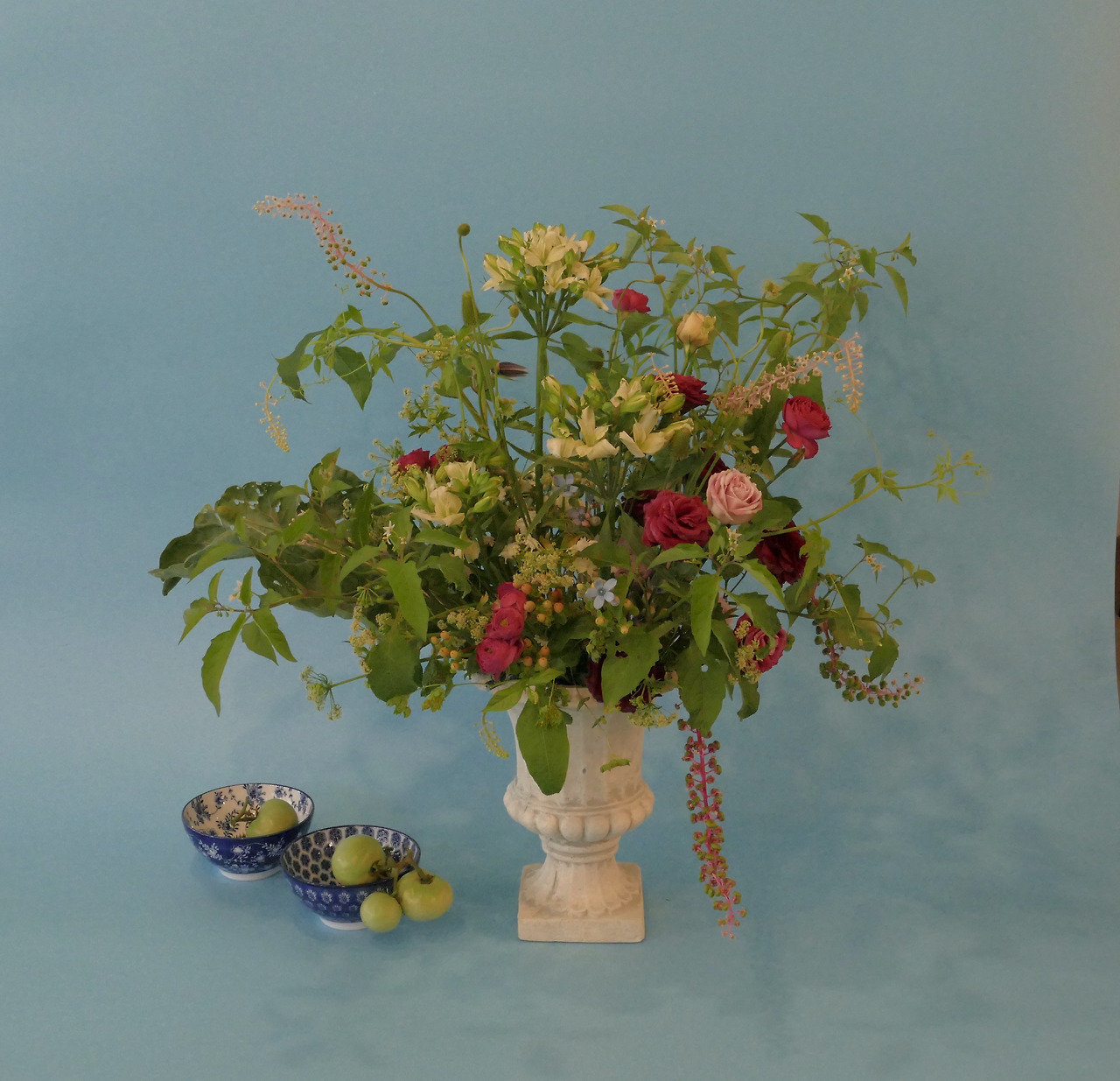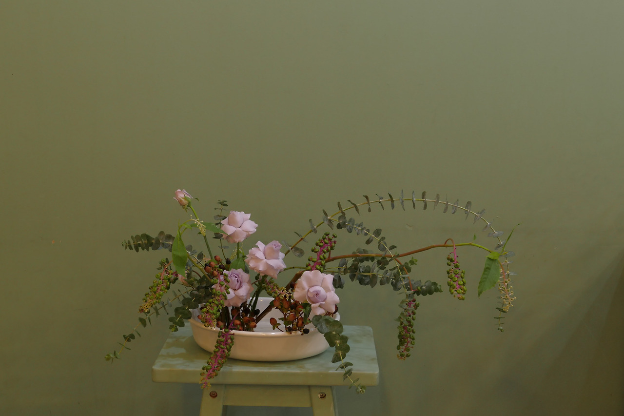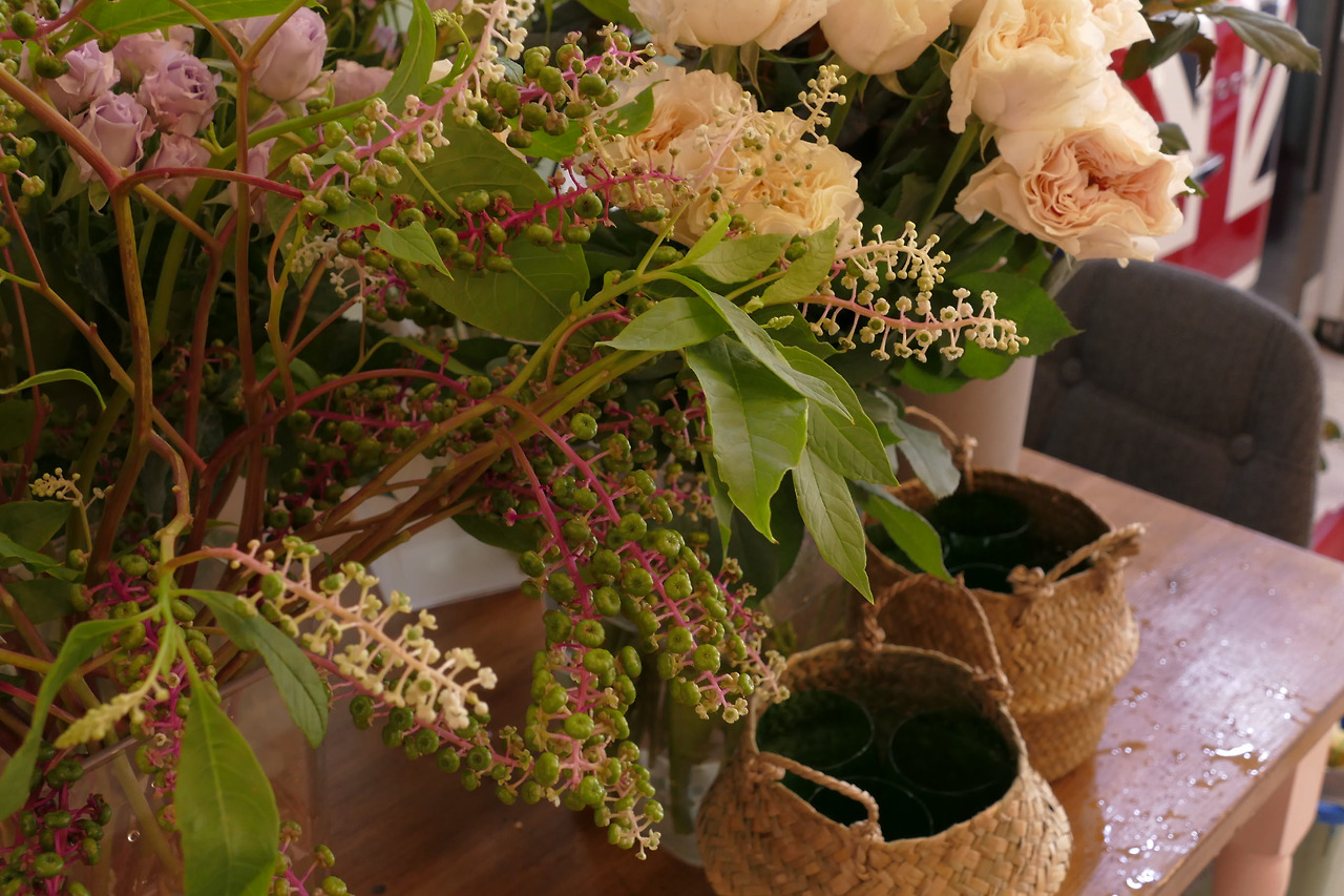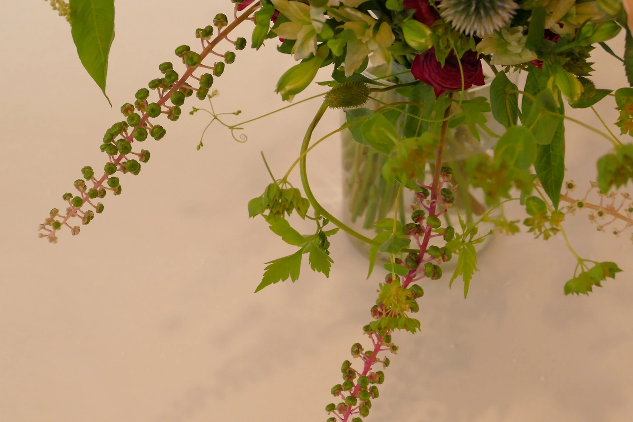 7월을 대표하는 그린 소재를 꼽으라면 나는 단연 미국 자리공이라고 할 것 같다. 더위와 함께 시장에 등장하는 미국 자리공은, 왜인지 모르지만 장녹수라는 꽤 반대되는 이름으로도 불린다. 미국 자리공인데 장녹수라니. 뭐가 뭔지 모르겠다.
